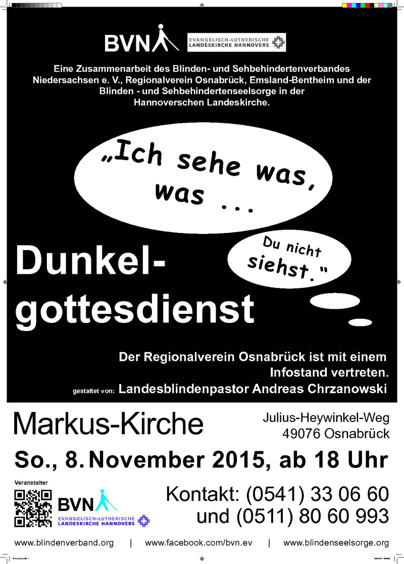 Am Sonntag, 8. November 2015, findet um 18 Uhr ein Dunkelgottesdienst in der Markus-Kirche am Julius-Heywinkel-Weg 2, 49076 Osnabrück statt.
