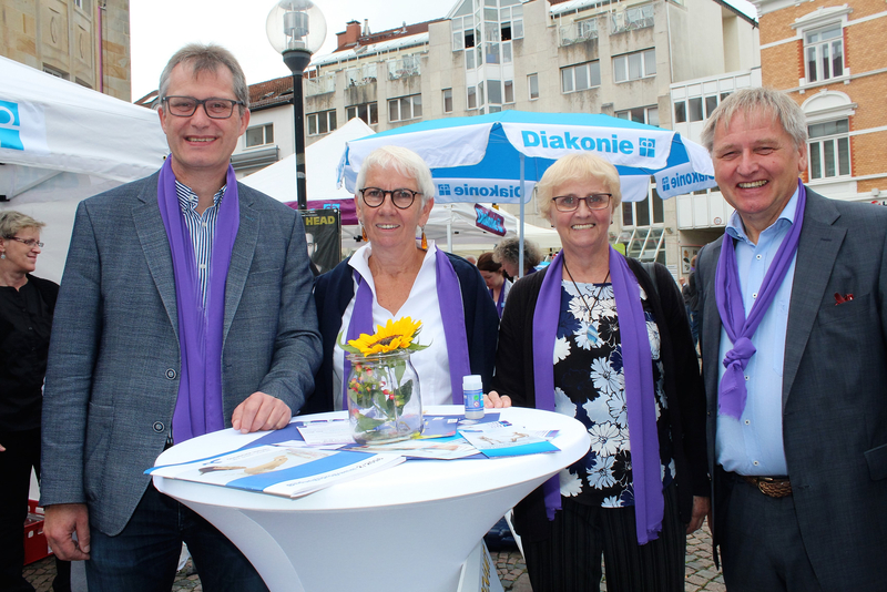 Zum Beispiel die Tanzgruppe der Hull Foundation, die in Glitterkleid und Zylinder Szenen aus dem inklusiven Musical „Grand Hotel Vegas“ auf Bühne und Straßenpflaster brachte. Michael Hull ließ es sich nicht nehmen, in den Reihen der Tänzer mit und ohne Behinderung den Takt vorzugeben. Dabei brachte er fast jeden Besucher zum Mittanzen. Locker und gut gelaunt übernahm Diakonie Pressesprecher Burkhard Teschner die Rolle des Moderators und führte nach der Begrüßung durch Renate Jacob, Vorsitzende des Diakonieausschusses im Kirchenkreis Osnabrück, durch den Vormittag.
