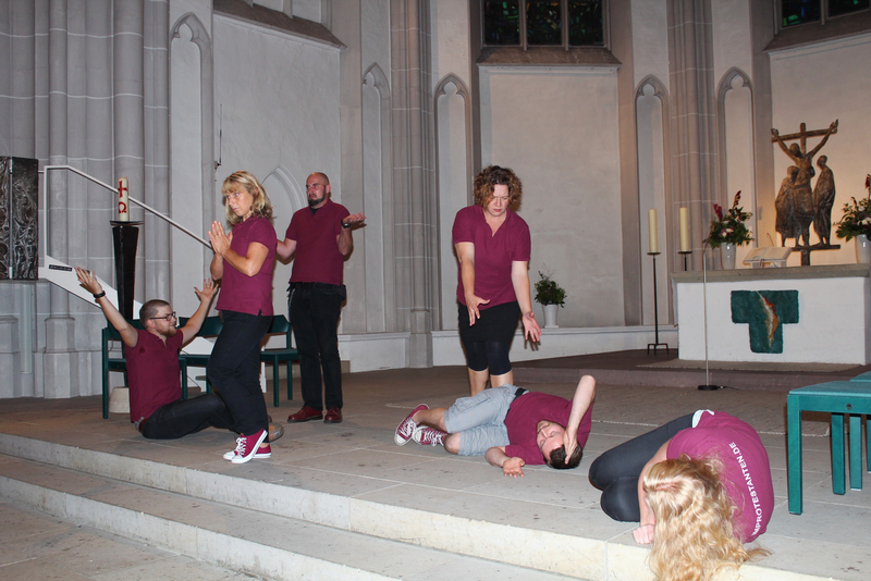 Scharfzüngig, blitzschnell und schonungslos setzten sich die Improtestanten der Ev. Fachschulen Osnabrück unter Leitung von Friedrike Niederdalhoff in Szene. Sie spielten mit jeder Faser ihres Körpers, mit Stimme und viel Kreativität. Dafür brauchten sie kein Drehbuch, Kostüm oder Bühne. Wohl aber das Publikum. Das gab reichlich Impulse, und die Improtestanten setzten sie um. „Ich bin ein Ablassbrief“, „Ich der Abfluss“ „Und ich ein verwirrter Christ“, ideenreich wurde Reformation und Gemeindeleben in Szene gesetzt. Ein Standbild war geformt und dann wurde es schwierig: „Welches Bibelwort passt dazu? Dagegen war leicht zu beantworten, als es um das wesentliche Talent eines weiblichen Gemeindegliedes ging: „Kuchen backen können, natürlich.“ Die Improtestanten der Evangelischen Fachschulen waren um keine Frage oder Antwort verlegen.