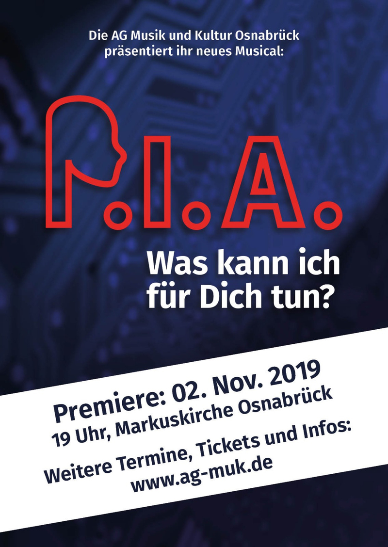 Am Samstag, 2. November, um 19 Uhr feiert das Musical „P.I.A. – Was kann ich für Dich tun?“ seine Premiere in der Markuskirche Osnabrück, Julius-Heywinkel-Weg 2. Mit „P.I.A.“ präsentiert die Arbeitsgemeinschaft Musik und Kultur Osnabrück ihre zehnte Eigenproduktion und feiert zugleich ihr 25. Jubiläum.
