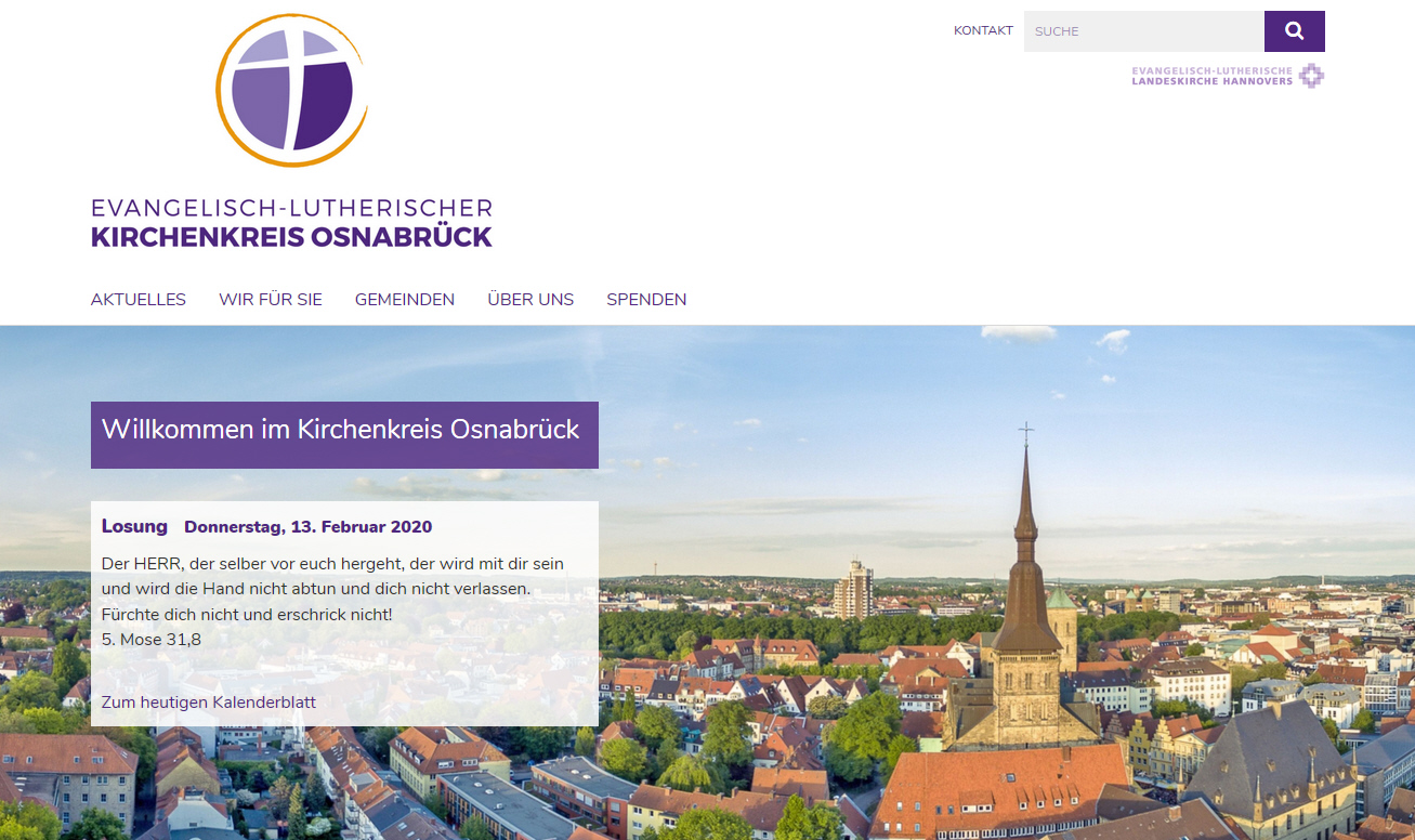 Der Kirchenkreis Osnabrück hat seine Internetseite neugestaltet und farblich an die kürzlich eingeführte, neue Wort-Bild-Marke angepasst. Die Navigation wurde mit fünf Hauptseiten bewusst übersichtlich gehalten. Auf der Startseite findet sich neben den aktuellsten Mitteilungen die Möglichkeit, den Rundflug – den Newsletter des Kirchenkreises – zu abonnieren sowie direkt zur Instagram-Seite des Kirchenkreises zu wechseln.