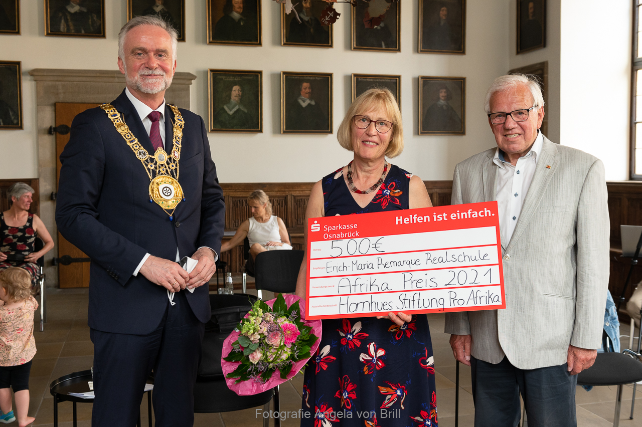 Die „Ellen und Karl-Heinz Hornhues Stiftung Pro Afrika“ verleiht alle zwei Jahre einen Afrika-Preis für Schulen und private gesellschaftliche Initiativen aus der Region Osnabrück, der mit 1.000 Euro dotiert ist. Die Erich-Maria-Remarque-Realschule teilt sich den diesjährigen Preis mit dem Verein „aBantu Development“.