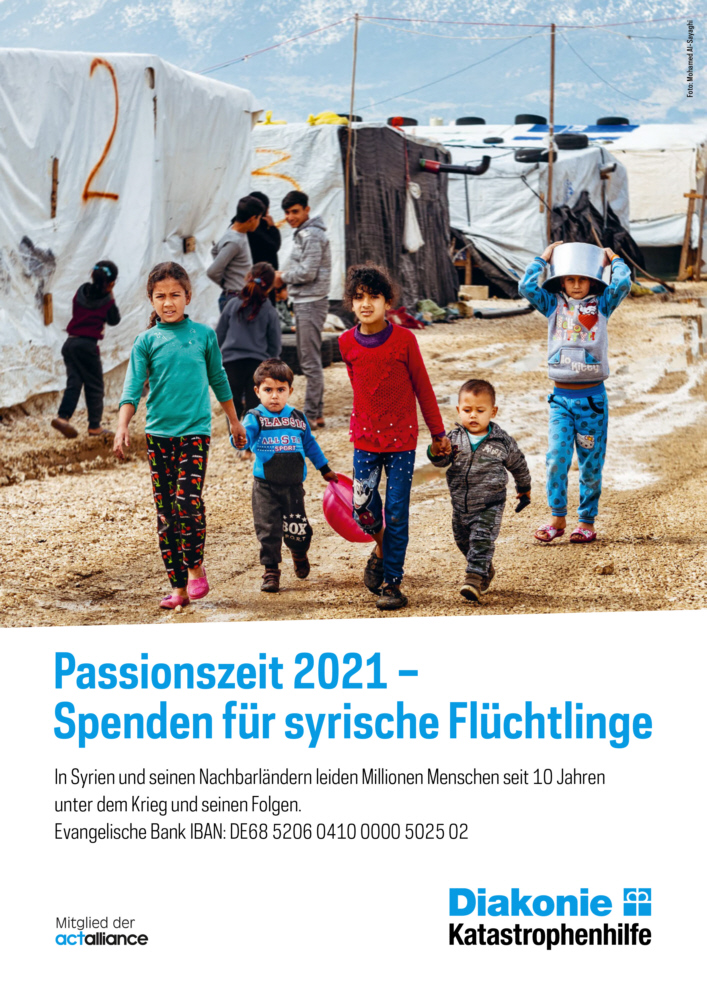 Die Diakonie Katastrophenhilfe richtet ihren Blick in der Passionszeit 2021 auf die Lebensbedingungen der Menschen in Syrien, wo der Krieg nun in sein zehntes Jahr geht. Wir sehen Millionen von syrischen Flüchtlingen – viele sind Vertriebene im eigenen Land, andere sind in umliegende Länder Syriens geflohen, manche noch weiter. Die Folgen für die syrische Bevölkerung sind dramatisch: Ihre Lebensgrundlagen sind oftmals zerstört. Krieg und Vertreibungen haben den Menschen schwer zugesetzt. Seit zehn Jahren leiden Syrerinnen und Syrer unter dem Krieg und seinen Folgen – es sind Menschen, deren lange Leidenswege uns in diesem Jahr vor Augen stehen.