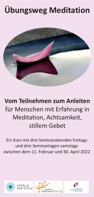 In den Gemeinden des Kirchenkreises Osnabrück finden sich zunehmend Menschen, die innehalten in ihrem oft geschäftigen Alltag, um gemeinsam in Stille zu meditieren. Meditation und das Gebet in der Stille sind eine alte christliche Tradition, die gerade heute Menschen wieder suchen. Die Fortbildung „Übungsweg Meditation“ richtet sich sowohl an Frauen und Männer, mit Erfahrung als Anleiter*in eines Meditationskreises als auch solche, die erstmalig den Schritt zum Anleiten wagen möchten. Die Fortbildung ist ökumenisch, es kooperieren die Kapelle der Stille, die Evangelische Erwachsenenbildung und die Katholische Erwachsenenbildung. Die Kursleitung liegt bei Doris Jäger, Pastorin der Kapelle der Stille, Schwester Simone Remmert, Geistliche Begleiterin im Bistum Osnabrück, und Gunhild Seyfert, Meditationsbegleiterin und Mitglied im Loccumer Arbeitskreis Meditation. Im Mittelpunkt der Fortbildung stehen das Meditieren, Achtsamkeitsübungen und Gebete mit leiblichen Gebärden. Die Teilnehmer*innen bekommen vielfältige Möglichkeiten, das Anleiten selbst auszuprobieren.