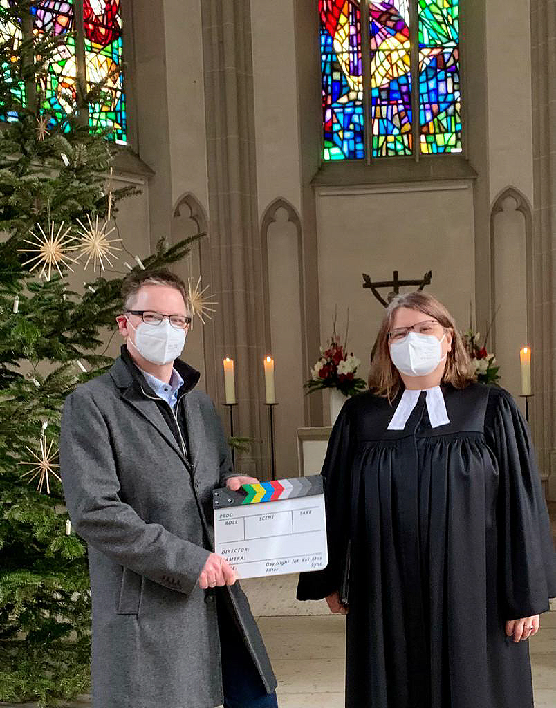 Der Kirchenvorstand überreichte Jutta Tloka einen Korb mit Reiseproviant. Im Gegenzug schenkte Frau Tloka der Katharinengemeinde eine Filmklappe für zukünftige Gottesdienstaufnahmen. Im Februar wird Dr. Tloka die Pfarrstelle in der Nordwestgemeinde in Osnabrück übernehmen.