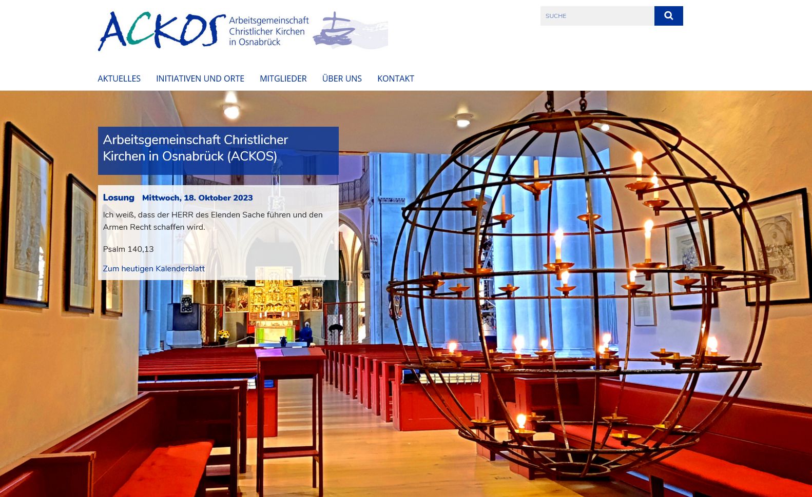 Die Arbeitsgemeinschaft Christlicher Kirchen in Osnabrück (ACKOS) präsentiert sich ab sofort mit einer neuen Website im Internet. Auf der Startseite werden die Besucher*innen vom Lichterglobus in der St.-Marien-Kirche begrüßt. „Um den Lichterglobus versammeln sich Angehörige unterschiedlicher Religionen jeden Samstag zum gemeinsamen Friedensgebet“, erläutert Frank Waniek, der die neue Website aufgebaut hat. „Das Friedensgebet als ökumenische Initiative in Osnabrück repräsentiert genau das Anliegen der ACKOS: Menschen verschiedener Konfessionen und Religionen zusammenzubringen und das Gemeinsame zu betonen statt das Trennende.“