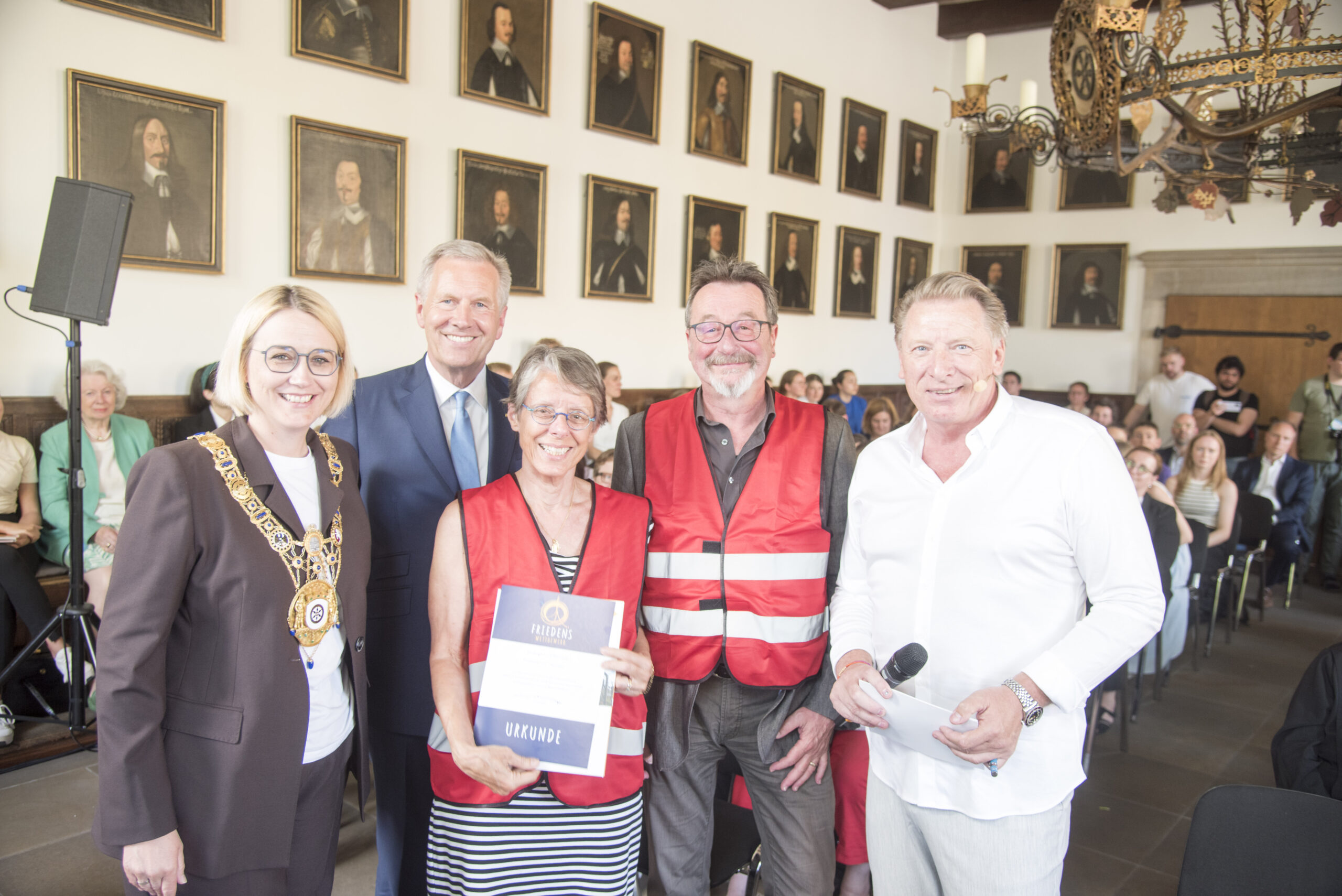 Fast 25.000 Teilnehmer*innen hat der zum ersten Mal veranstaltete Friedenswettbewerb der Katholischen Friedensstiftung mit Sitz in Hamburg verzeichnet. Die Schirmherrschaft für den Wettbewerb hatte Bundespräsident a.D. Christian Wulff übernommen. Bei der Preisverleihung im historischen Rathaus in Osnabrück erhielt die Initiative für die Organisation der Friedenskette zwischen Osnabrück und Münster einen Sonderpreis.