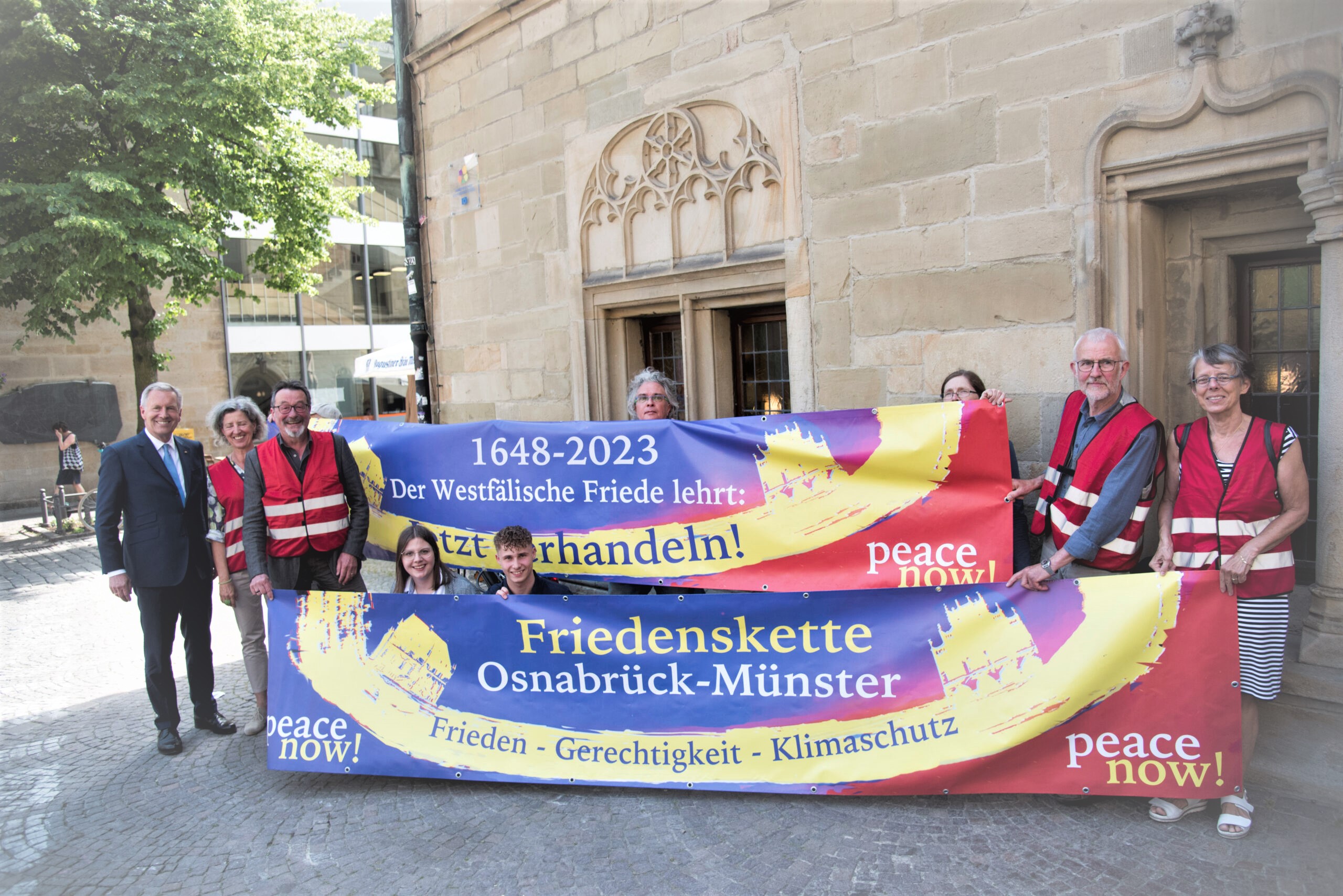 Am 24. Februar hatten mehr als 20.000 Menschen eine über 50 Kilometer lange Friedenskette zwischen Osnabrück und Münster gebildet und damit ihre Wünsche nach Frieden, Gerechtigkeit und Klimaschutz dokumentiert. „Die Friedenskette steht auch weiterhin als Symbol und Denkanstoß für die Forderung nach Friedensverträgen unter Wahrung der territorialen Souveränität bei allen kriegerischen Auseinandersetzungen auf der Welt“, teilen Rixa Borns vom Friedensforum Münster, Johannes Bartelt von der Osnabrücker Friedensinitiative und Meike Jacobs und Matthias Binder vom Friedensort Osnabrück / FO:OS als Vertreter*innen des Organisationsteams mit. Sehr viele Vereine, Kirchengemeinden, Schulen, Gewerkschaften, Parteien, Betriebe, Bürgerinitiativen, Nachbarschaften aus den Friedensstädten Osnabrück und Münster sowie aus vielen anderen Kommunen in Niedersachsen und Nordrhein-Westfalen hätten zur Teilnahme an der Friedenskette aufgerufen und sich aktiv beteiligt. „Wir freuen uns, dass dieses Engagement mit einem Sonderpreis der Katholischen Friedensstiftung Hamburg geehrt wird. Dieser Preis ist für uns alle Anerkennung und Auftrag, uns weiter für unsere Forderungen und eine zivile Konfliktbearbeitung einzusetzen“, so die Organisator*innen der Friedenskette. Stellvertretend für die vielen Teilnehmer*innen der Aktion nehmen Vertreter*innen der Osnabrücker Friedensinitiative (OFRI), des Friedensforums Münster und der Kirchen im Osnabrücker Rathaus die Urkunde entgegen.