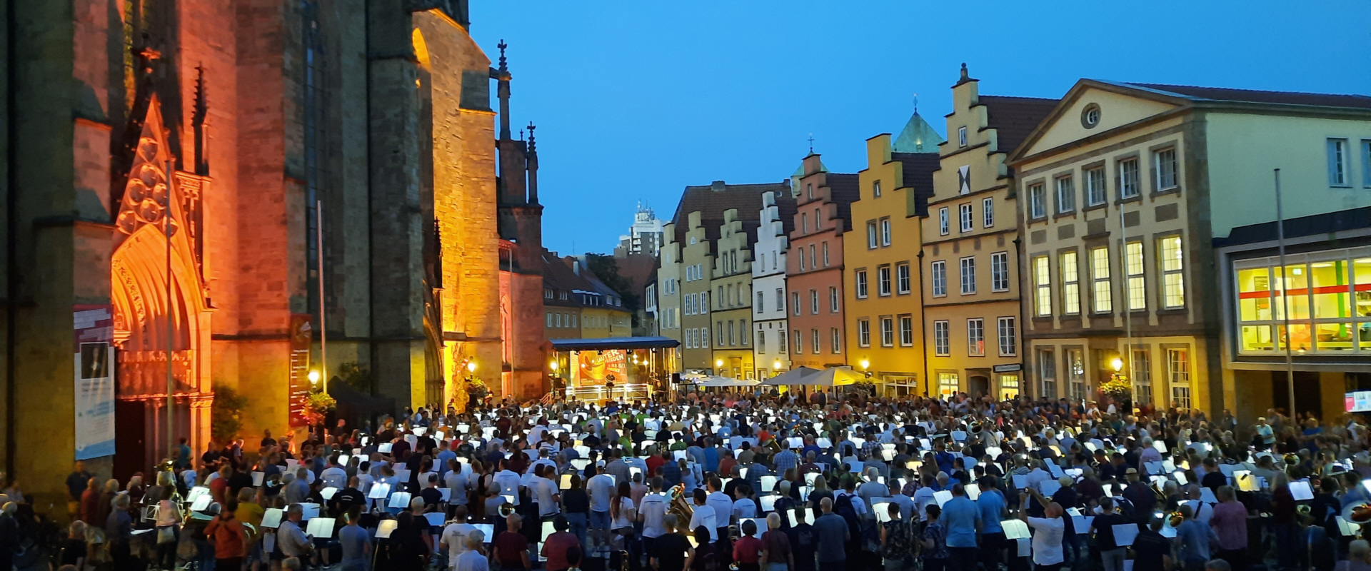 „Großartig, erhebend, unglaublich, ein Wahnsinn“ – die Serenade in den weiteren Abendstunden auf dem Markt zwischen Giebelhäusern, Rathaus und St. Marien begeisterte alle, die dabei waren, zufällig vorbei kamen und stehen blieben. Der „schönste Patz Deutschlands“ fasste an dem Abend rund 600 Bläserinnen und Bläser, die ihre „Lieblings-Hitliste“ aus 125 Jahren Posaunenliteratur spielten.