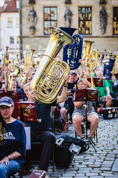 Es war heiß, es war golden, es war strahlend, schön und voll. 1.000 glänzende Instrumente, Musiker*innen zwischen 6 und 86 und Kompositionen aus über 100 Jahren. Das Große Tutti der Bläser ließ erneut den Platz vor dem Rathaus des Westfälischen Friedens vibrieren. „Das war für mich einfach ein überwältigendes Bild. So viele Menschen, die gemeinsam Musik machen! Und die das zu ihrer eigenen Freude und zur Ehre Gottes tun. Es tut gut, an solchen Tagen zu erleben, wie lebendig unsere Kirche ist!“, blickt Regionalbischof Friedrich Selter auf den Samstagvormittag zurück, den er zusammen mit Marianne Gorka moderierte.