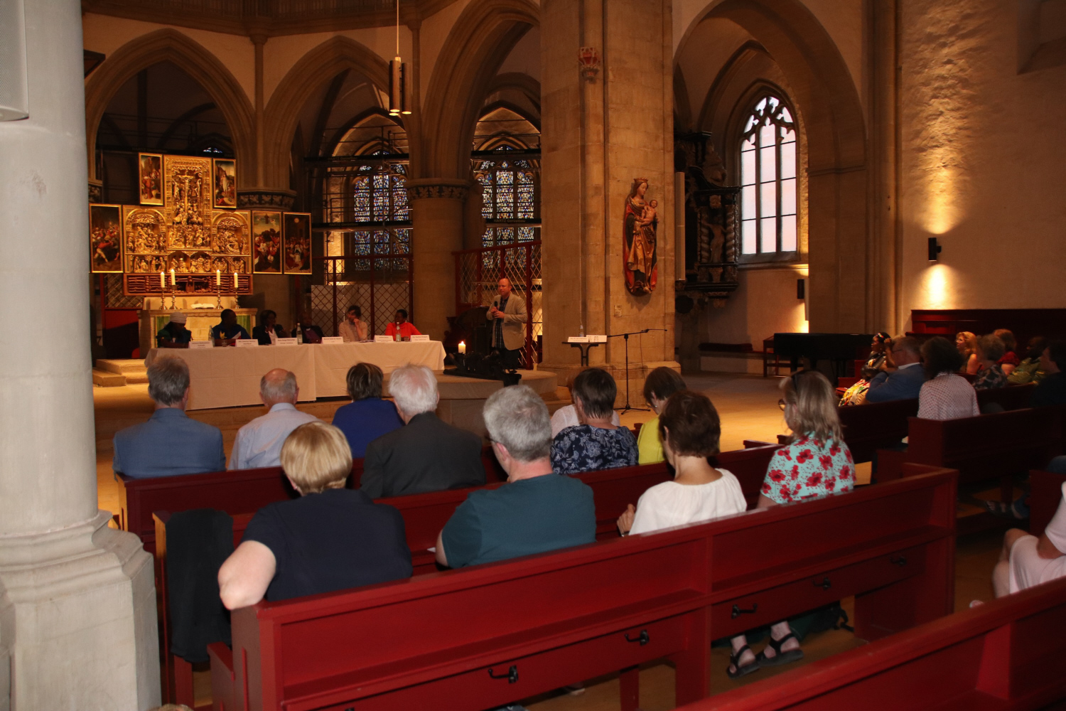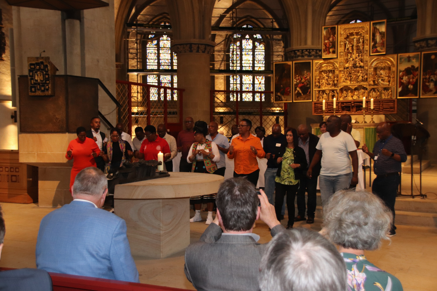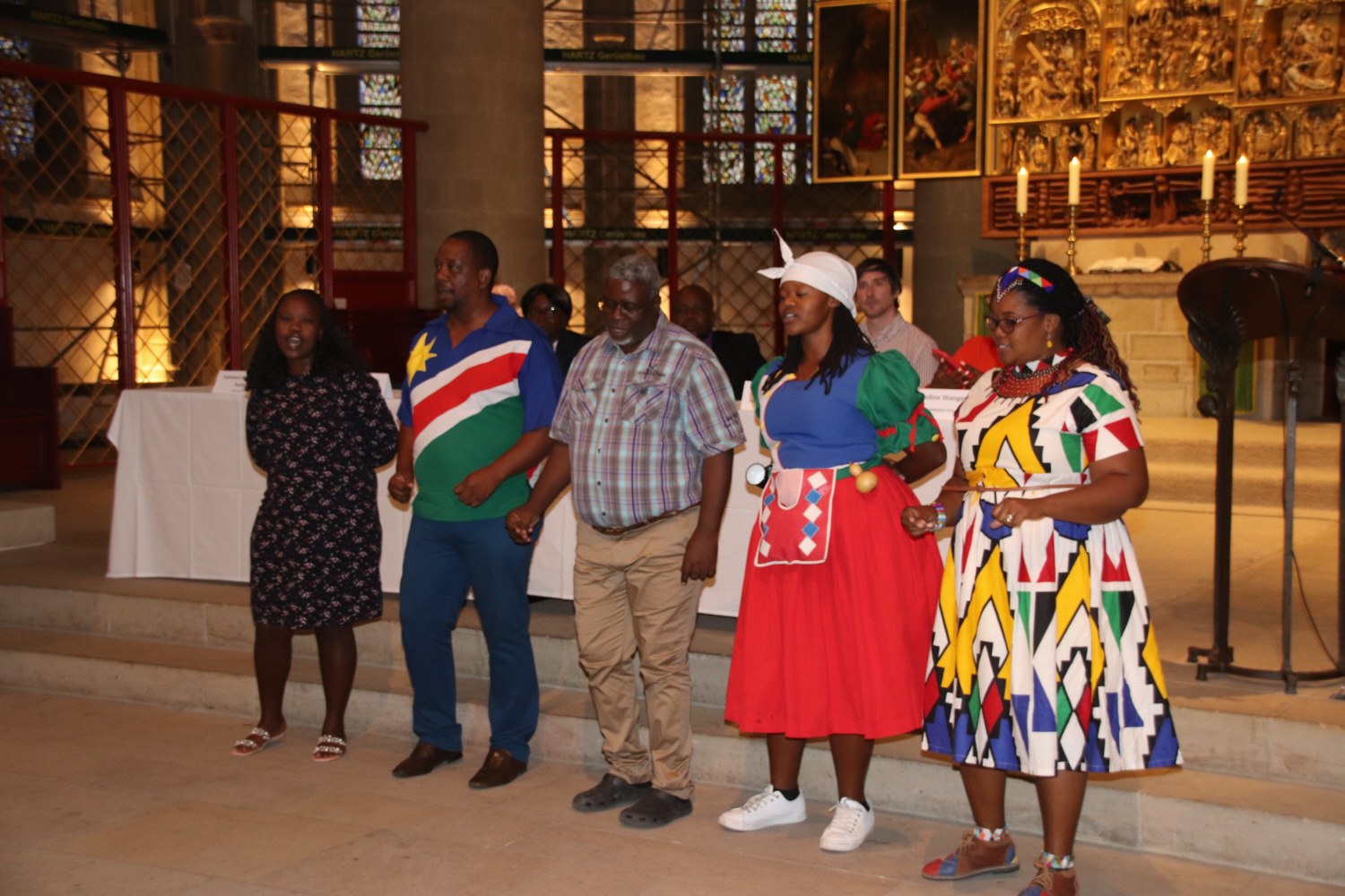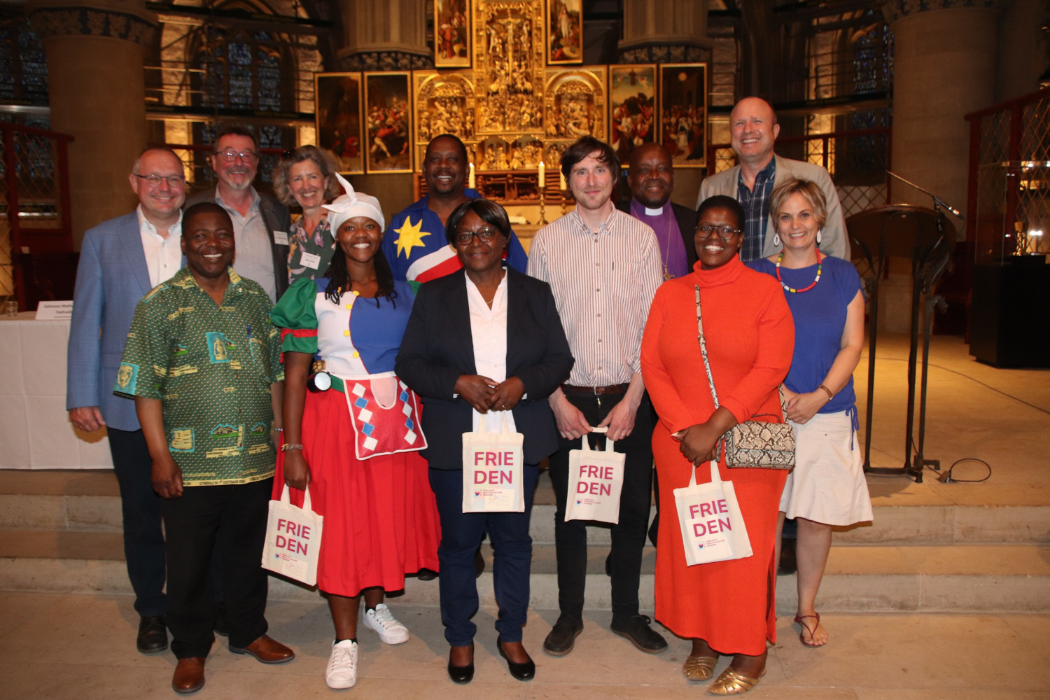 Frieden, Zerstörung, Vergessen, Gerechtigkeit, Vergebung – das waren nur einige der Themen, die am Vorabend des Ökumenischen Kirchentages bei dem Podiumsgespräch „Gegen ‚Das ewige Vergessen‘ – eine internationale Perspektive auf Erfahrungen mit Versöhnung und Wiedergutmachung“ besprochen wurden. Podiumsgäste aus Namibia, der Demokratischen Republik Kongo, Südafrika und Deutschland berichteten. Nach einer Einführung durch Meike Jacobs und Pastor Matthias Binder vom Friedensort Osnabrück FO:OS des Evangelisch-lutherischen Kirchenkreises Osnabrück übernahm Pastor Dr. Joe Lüdemann vom mitveranstaltenden Evangelisch-lutherischen Missionswerk (ELM) Hermannsburg die Moderation und Übersetzung für den Abend. Möglich war die Veranstaltung durch den Besuch von Partnerschaftsdelegationen, der von den Partnerschaftsausschüssen in den Evangelisch-lutherischen Kirchenkreisen Osnabrück, Bramsche, Melle-Georgsmarienhütte und Tecklenburg organisiert wurde.