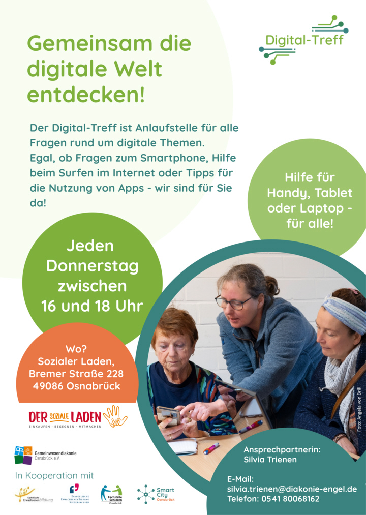 Der Digital-Treff im Widukindland (Digitale Sprechstunde Widukindland) findet jeden ersten und dritten Montag im Monat von 15 bis 16:30 Uhr im Gemeindehaus der katholischen St.-Bonifatius-Gemeinde, Widukindplatz 1, 49086 Osnabrück, statt. Hier ist eine Anmeldung unter Telefon 0541 91194696 erwünscht. Der Digital-Treff in Schinkel-Ost findet jeden Freitag von 10 bis 12 Uhr im Jakobus-Gemeindehaus der Evangelisch-lutherischen Apostel-Gesamtkichengemeinde, Ölweg 23, 49084 Osnabrück, statt.