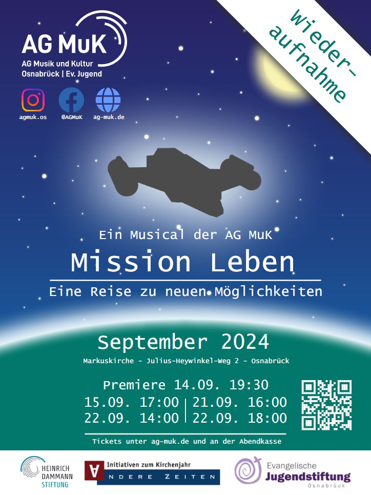 Nach drei erfolgreichen Vorstellungen im vergangenen Jahr und begeisterten Reaktionen des Publikums hat die AG Musik und Kultur der Evangelischen Jugend Osnabrück (AG MuK) entschieden, ihr neuestes Musical „Mission Leben“ in diesem Jahr noch einmal auf die Bühne der Markuskirche zu bringen. Die ehrenamtliche Crew aus Jugendlichen und jungen Erwachsenen wird ihr selbst geschriebenes Stück dabei zudem noch erweitern. Zuschauer*innen, die das Stück bereits gesehen haben, dürfen sich also auf eine spannende Fortführung von „Mission Leben – Eine Reise zu neuen Möglichkeiten“ freuen.