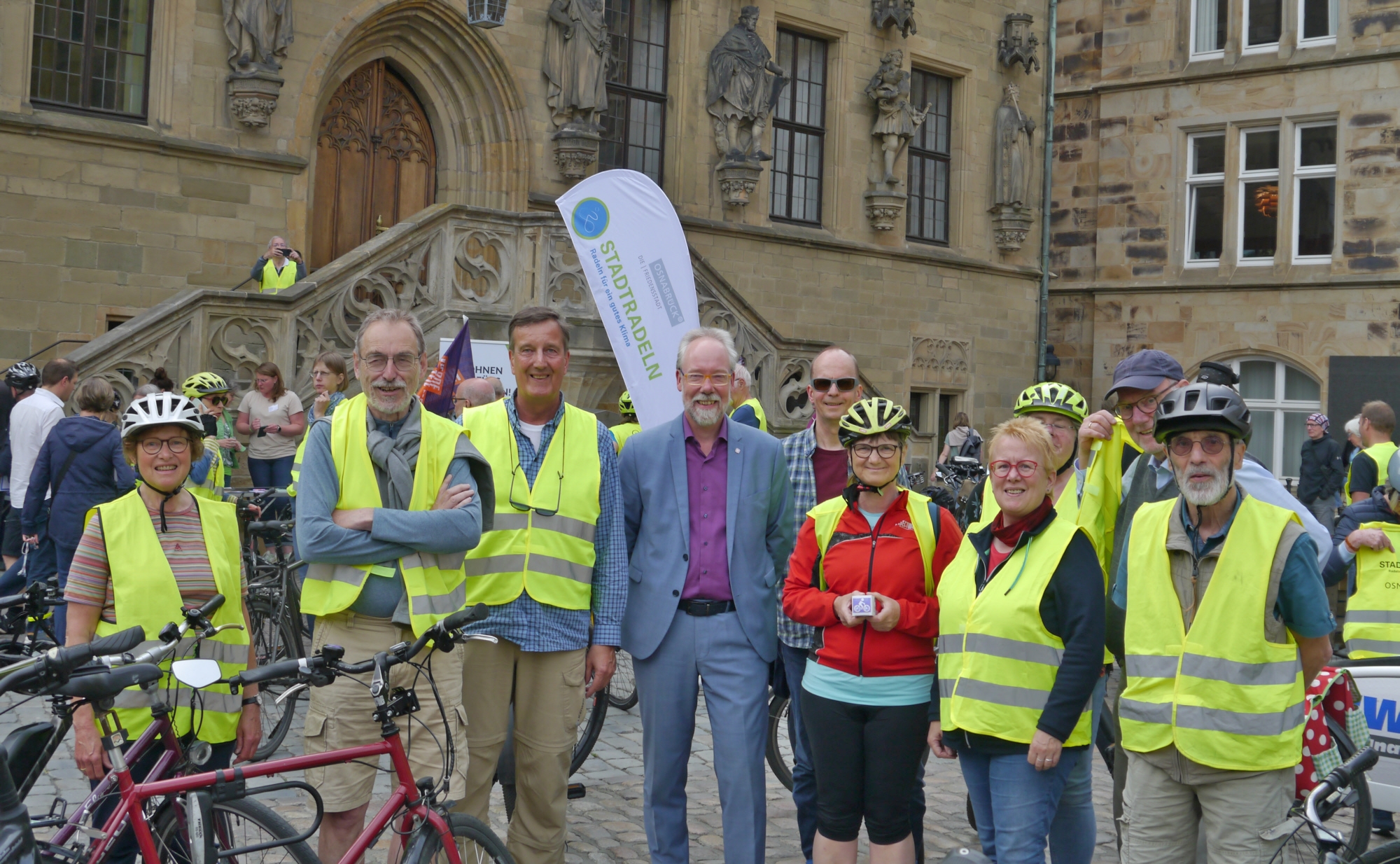 Am Montag haben sich rund 100 Radlerinnnen und Radler auf dem Markt vor dem historischen Rathaus Osnabrück getroffen, um an der Auftakttour zum diesjährigen Stadtradeln teilzunehmen. Darunter waren auch mehrere Mitglieder aus dem Team des Evangelisch-lutherischen Kirchenkreises Osnabrück, der dieses Jahr zum fünften Mal dabei ist. Bei der Kampagne des Klima-Bündnisses geht es darum, innerhalb von drei Wochen möglichst viele Alltagswege klimafreundlich mit dem Fahrrad zurückzulegen. Die Aktion 2024 läuft vom 27. Mai bis zum 16. Juni. Anmelden für das Kirchenkreis-Team kann man sich auch noch nach Beginn und während des gesamten Aktionszeitraums.