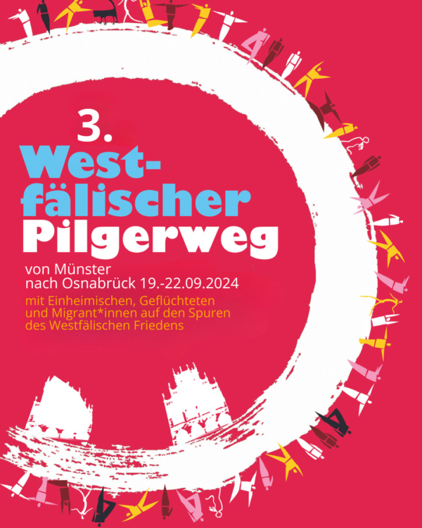 Der dritte ökumenisch-internationale Westfälische Friedenspilgerweg führt vom Friedenssaal in Münster zum Friedenssaal nach Osnabrück. Geflüchtete, Migrant*innen, Bewohner*innen aus der direkten Region und den Niederlanden begeben sich gemeinsam auf die Spuren des Westfälischen Friedens von 1648. Zwischenstationen des 74 km langen Weges sind Ladbergen und Lengerich, wo wichtige Verhandlungen stattfanden.