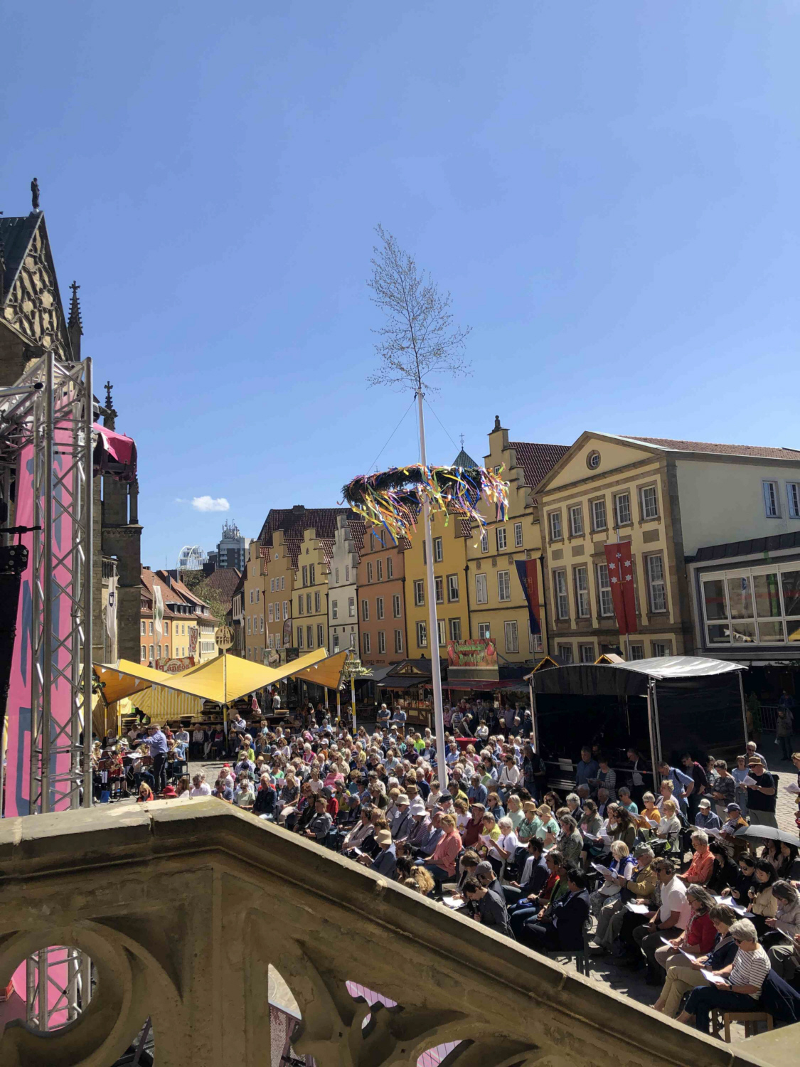 „Hine mah tov“* – sangen die Jugendchöre, die Posaunen eröffneten mit einer Fanfare den ökumenischen Gottesdienst und begleiteten den Gesang der gut 200 Bersucherinnen und Besucher. Für einen Gedenk- und Friedensgottesdienst zu 80 Jahre Kriegsende kann es in Osnabrück keinen besseren Ort geben als den zwischen dem Rathaus des Westfälischen Friedens und der St.-Marien-Kirche. Das Bild auf dem Platz ähnelte dem des Ökumenischen Kirchentages im Frühjahr 2023 zum Gedenken an 375 Jahre Westfälischer Frieden und des Landesposaunenfestes „Lauter Frieden“ im Herbst desselben Jahres. Die Sonne spiegelte die Fassaden des schönsten Platzes von Osnabrück in den Posaunen und Trompeten, die Stühle reichten nicht und auf der Maiwochen-Bühne gab es Musik, Worte und Wünsche zum Frieden. Nicht nur von den Verterter*innen der christlichen Kirchen in Osnabrück, die zu diesem Gottesdienst eingeladen hatten, sondern auch von Oberbürgemeisterin Katharina Pötter und den Delegationsleiter*innen der Osnabrücker Partner- und Freundschaftsstädte aus Angers, Çanakkale, Derby, Greifswald, Gwangymeong, Haarlem und Hefei.