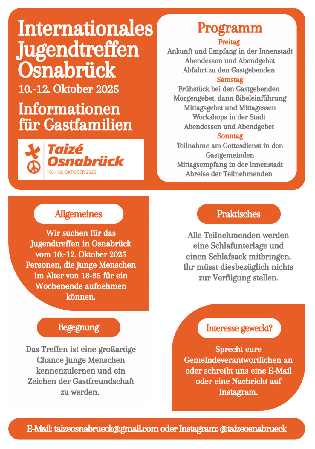 Anmeldungen für Gastgebende sind ab sofort online möglich. „Alle Teilnehmenden bringen eine Schlafunterlage und einen Schlafsack mit. Der Aufwand für die Gastfamilien ist überschaubar. Gleichzeitig ist es eine großartige Chance, Gastfreundschaft zu zeigen und spannende Menschen kennenzulernen“, ergänzt von Fintel. Weitere Informationen gibt es über Instagram @taizeosnabrueck oder per E-Mail (taizeosnabrueck@gmail.com).