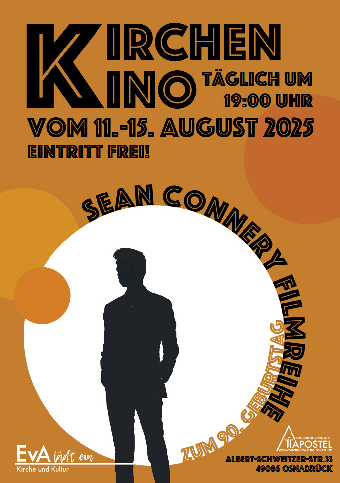 Im August setzt die Evangelisch-lutherische Apostel-Gesamtkirchengemeinde ihr Kirchen-Kino mit einer Filmreihe zum 90. Geburtstag von Sean Connery fort. Von Montag, 11., bis Freitag, 15. August, werden täglich um 19 Uhr ausgewählte Filme mit dem beliebten Schauspieler in seiner legendären Rolle, die ihn weltberühmt gemacht hat, in der Petruskirche, Albert-Schweitzer-Straße 33, 49086 Osnabrück, gezeigt.