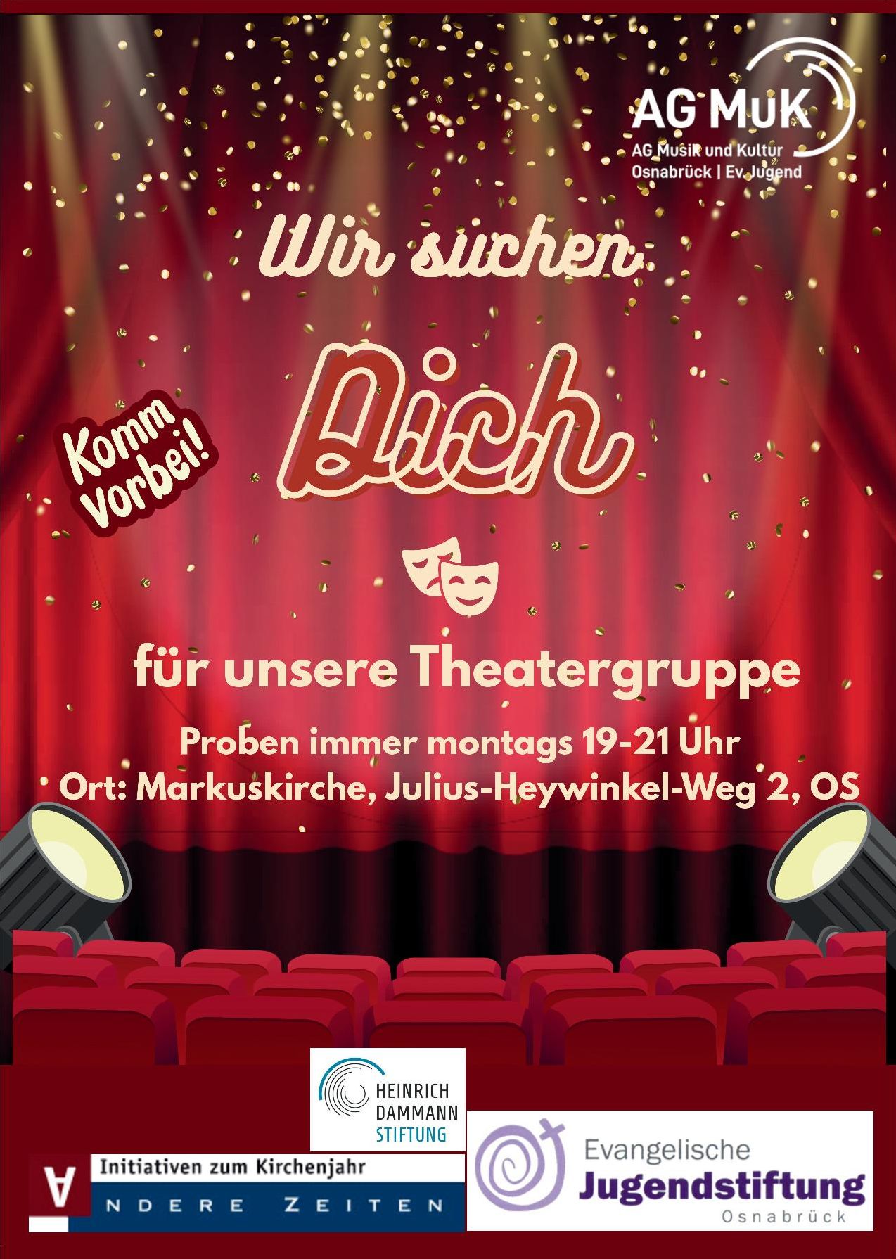 Angesprochen sind Menschen zwischen 16 und 30 Jahren, die Spaß am Theaterspielen haben, neue Leute kennenlernen möchten und gemeinsam etwas auf die Beine stellen wollen. Die Gruppe trifft sich regelmäßig montags von 19 bis 21 Uhr in der Evangelisch-lutherischen Markuskirche, Julius-Heywinkel-Weg 2, 49076 Osnabrück. Wer mag, kann bei einem Treffen dabei sein. Weitere Kontaktmöglichkeiten sind Nachrichten bei Instagram (@agmuk.os) oder per E-Mail (info@ag-muk.de).