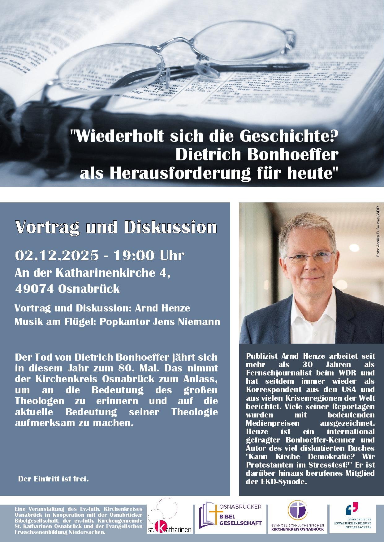 Der Tod des Theologen Dietrich Bonhoeffer hat sich am 9. April 2025 zum 80. Mal gejährt. Sein Wirken und seine Werke sind bis in die heutige Gegenwart sehr deutlich wahrnehmbar. „Fast wirkt es, als seien sie aktueller denn je“, sagt Dr. Joachim Jeska, Superintendent des Evangelisch-lutherischen Kirchenkreises Osnabrück. Dass Bonhoeffer bis heute Wirkung habe, zeigten unter anderem drei Veranstaltungen, die durch mehrere Kirchengemeinden, die Osnabrücker Bibelgesellschaft, die Evangelische Erwachsenenbildung und den Kirchenkreis vorbereitet würden.