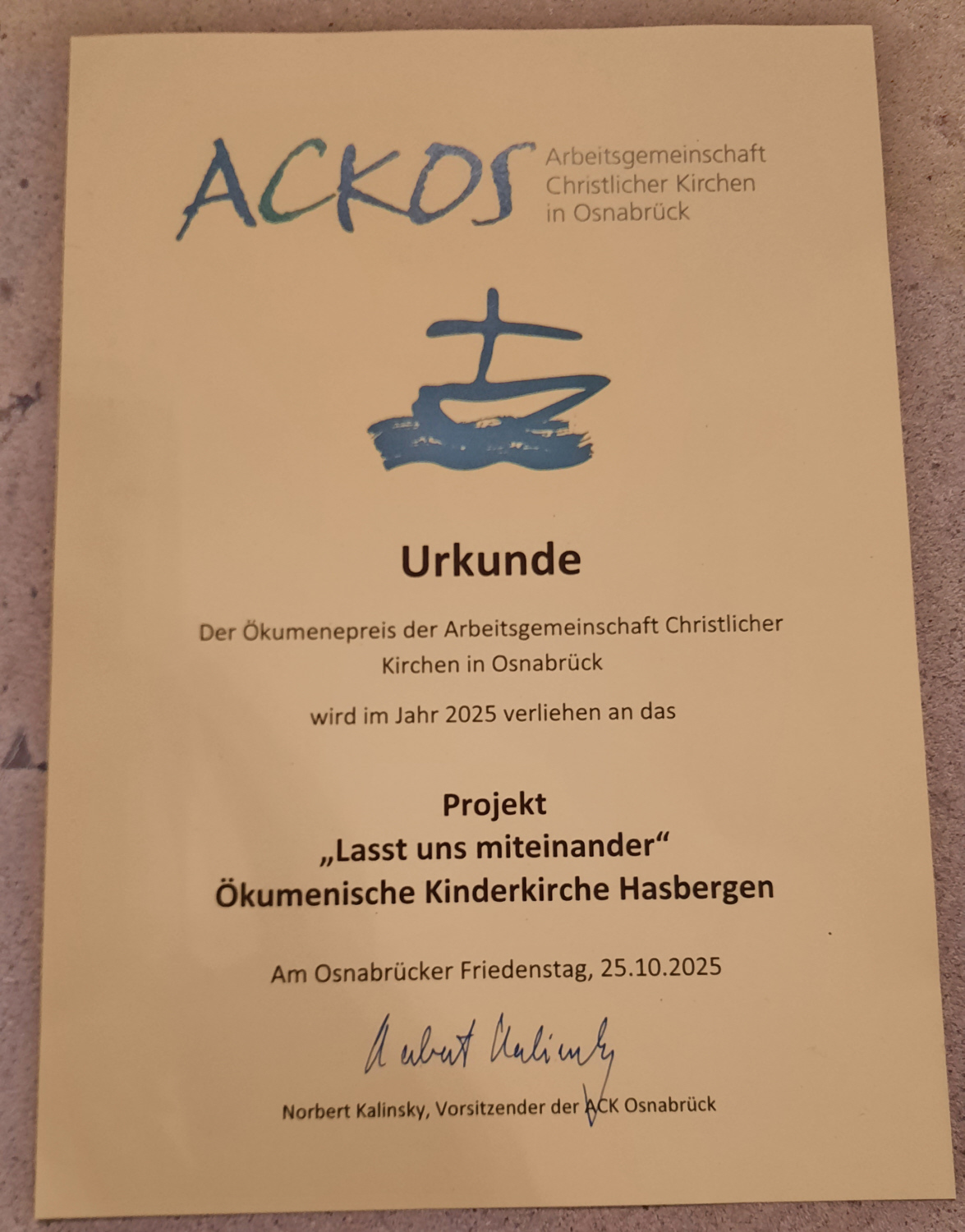 Beim ökumenischen Friedensgottesdienst in der St.-Marien-Kirche wurde jetzt zum elften Mal der Osnabrücker Ökumenepreis der Arbeitsgemeinschaft Christlicher Kirchen in Osnabrück (ACKOS) verliehen. In diesem Jahr wurde das Projekt „Lasst uns miteinander … – Die Ökumenische Kinderkirche Hasbergen“ ausgezeichnet. Monatlich wird abwechselnd in der evangelischen-lutherischen Christus-Kirche und der katholischen St.-Josef-Kirche in Hasbergen eine offene Kinderkirche für Kinder bis 10 Jahren angeboten. „So wird deutlich, dass Ökumene im Kleinen beginnt – in den Herzen der Kinder, die ohne Vorbehalte zusammenkommen, beten, lachen und glauben“, sagte Norbert Kalinsky, Vorsitzender der ACKOS, in seiner Laudatio.