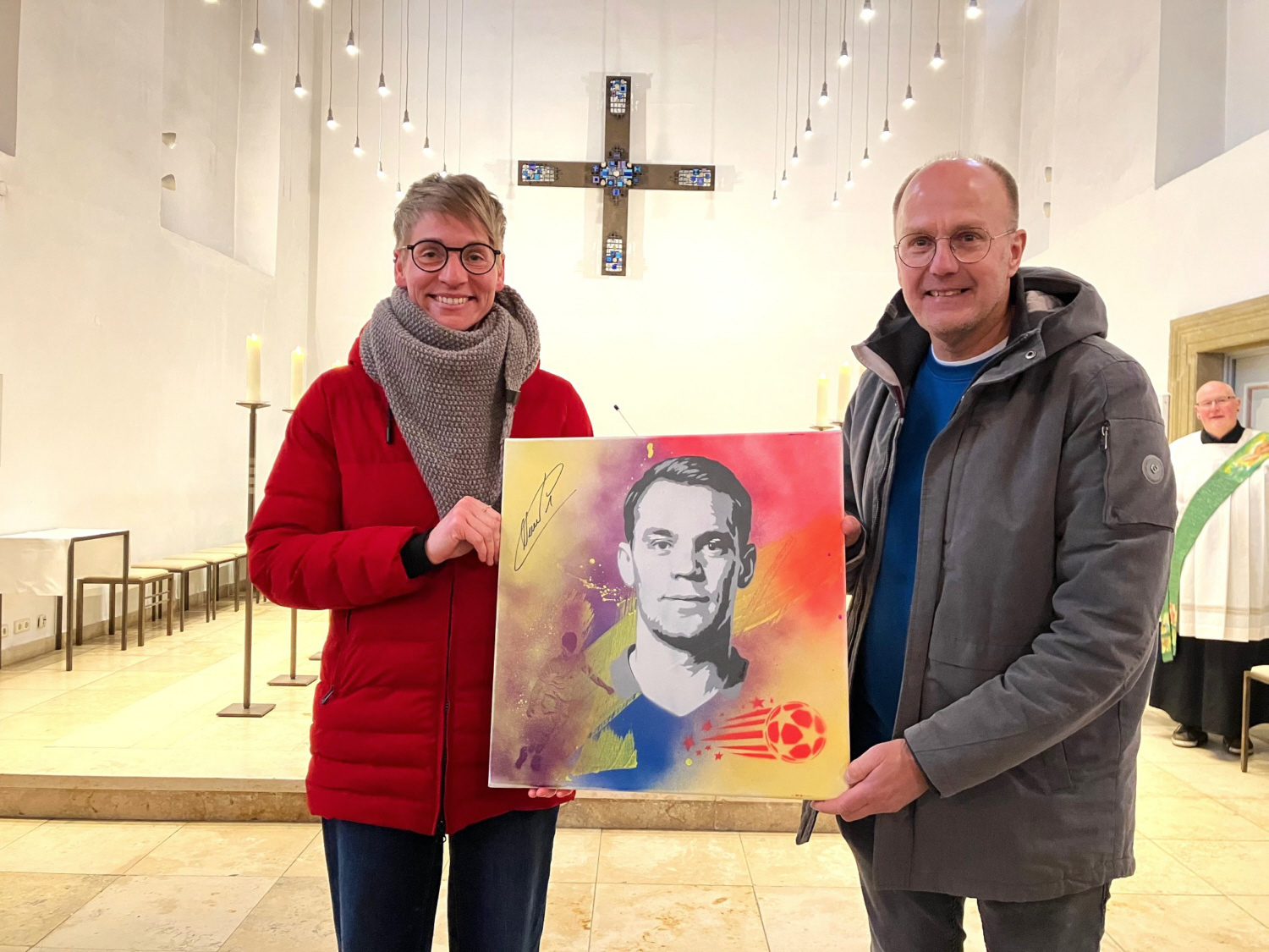 Unter allen Spender*innen hatte Julia Hoppe eine glückliche Hand bei ihrer Überweisung. Sie wurde ausgelost und erhielt von Mika Springwald, Künstler und Caritas-Sozialarbeiter, ein besonderes Unikat. Er hatte mit Jugendlichen aus Melle ein Porträt von Manuel Neuer entworfen und gesprüht. Der Nationaltorwart signierte das Kunstwerk für diese Aktion. Julia Hoppe berichtet, dass sie regelmäßig für die Aktionen der DiakonieStiftung spendet. „Es lohnt sich immer und gibt ein gutes Gefühl,“ so die Gewinnerin.