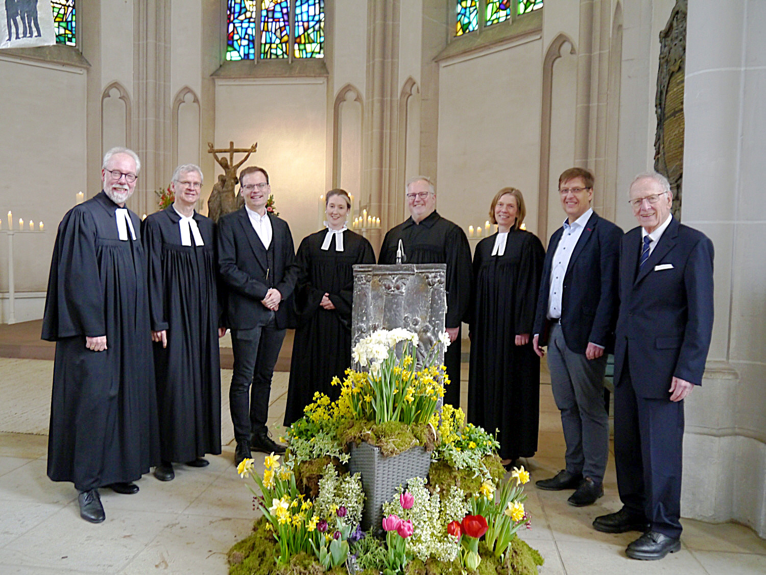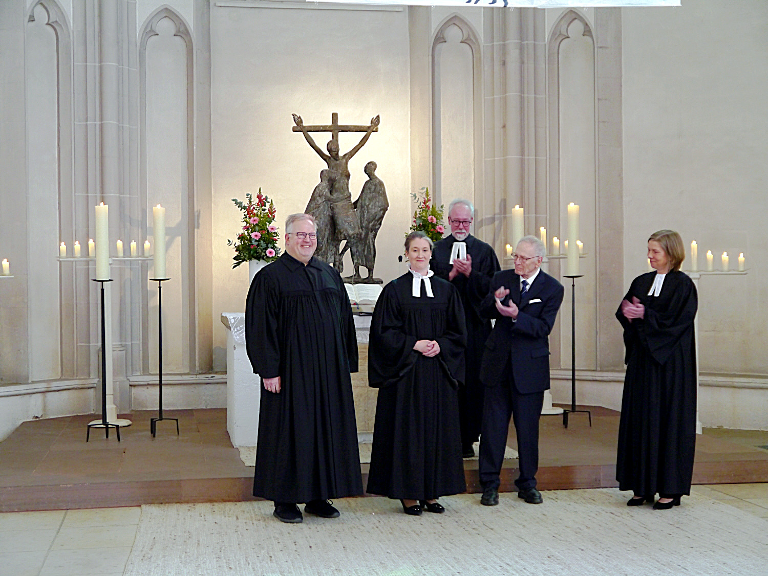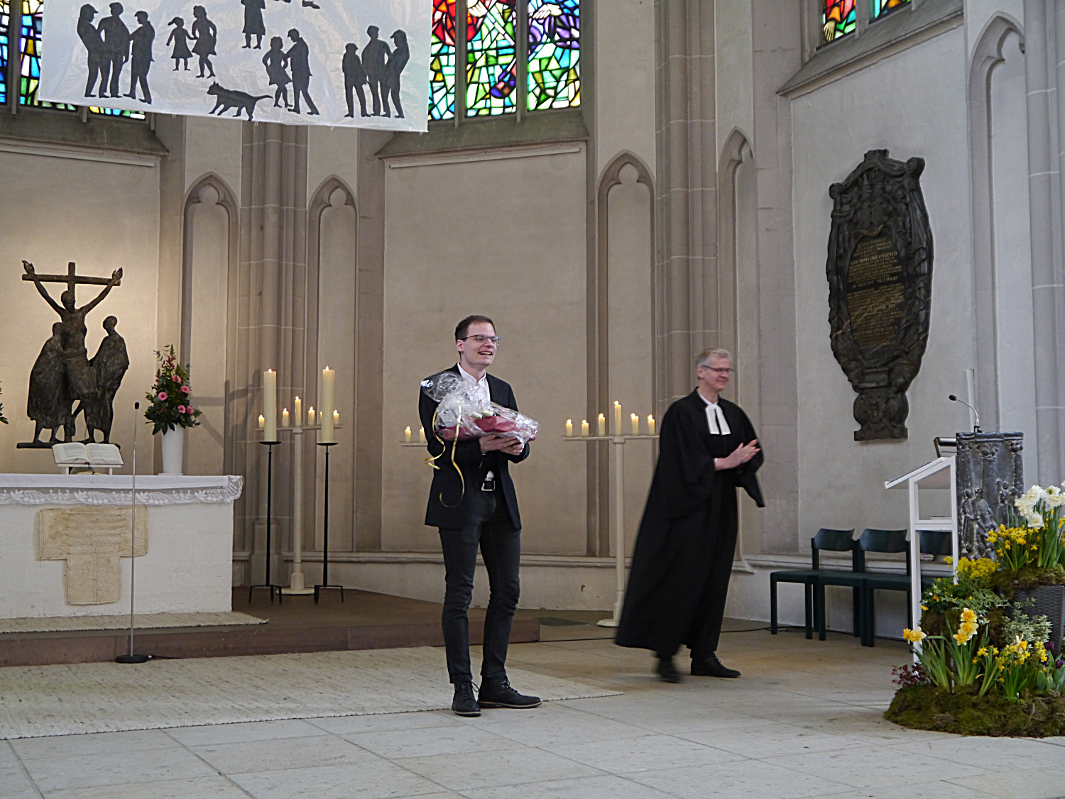 Im gleichen Gottesdienst wurde Pastor Jan Edelstein mit großem Dank und besten Wünschen verabschiedet. Nach drei Jahren Probedienst in der St.-Katharinen-Gemeinde geht er in die Kirchengemeinde Barkhausen-Rabber in Bad Essen im Nachbarkirchenkreis Melle-Georgsmarienhütte. Pastor Otto Weymann hob sein stets „interessiertes, aufmerksam hinhörendes Herz“ hervor. „Die Räume, die du geöffnet hast, haben Menschen betreten. Und die Zeit, die du gegeben hast, wurde von den Menschen genutzt.“