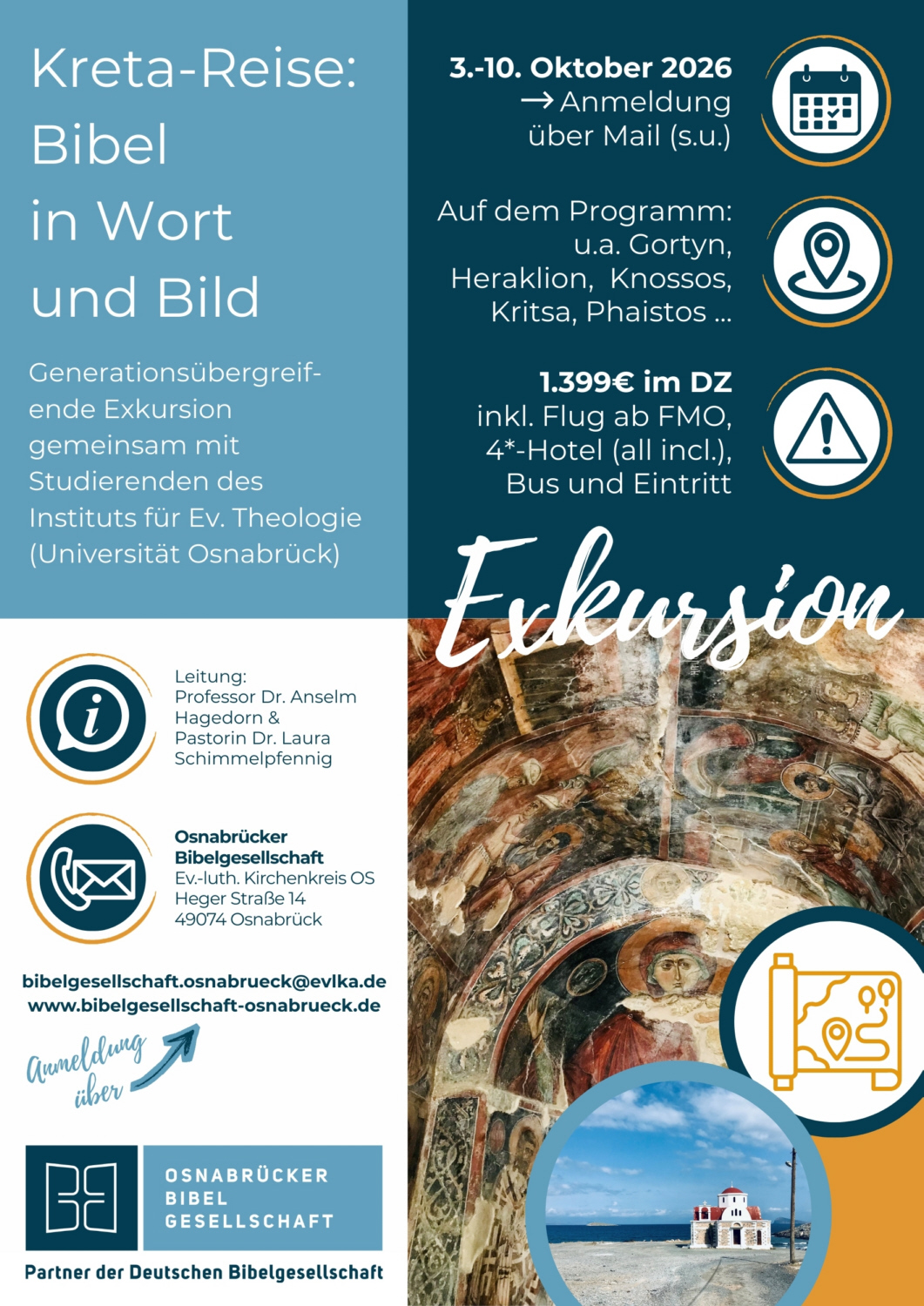 Nach langer Zeit bietet die Osnabrücker Bibelgesellschaft wieder eine erste Exkursion an. Vom 3. bis zum 10. Oktober 2026 geht es unter Leitung von Professor Dr. Anselm Hagedorn und Pastorin Dr. Laura Schimmelpfennig gemeinsam mit Studierenden des Instituts für Evangelische Theologie der Universität Osnabrück unter dem Motto „Bibel in Wort und Bild“ nach Kreta!