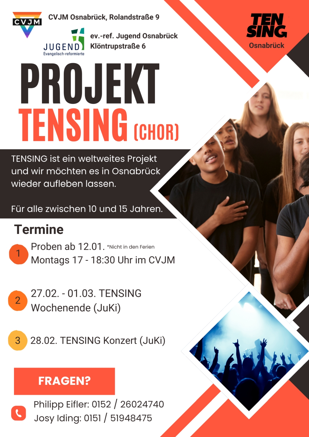 Der CVJM Osnabrück und die Evangelisch-reformierte Jugend Osnabrück möchten das Chor-Projekt „TENSING“ in Osnabrück neu aufleben lassen. Das Projekt bietet Jugendlichen zwischen 10 und 15 Jahren die Möglichkeit, sich auszuprobieren, laut zu sein, kreativ zu werden und gemeinsam etwas Großes auf die Beine zu stellen. Ob Singen, Tanzen, Theater, Band, Technik, Deko, Social Media oder neue Ideen – hier entscheidet die Mitwirkenden, was passiert.