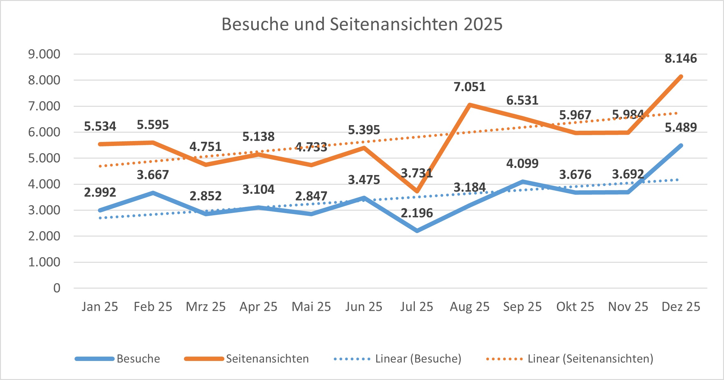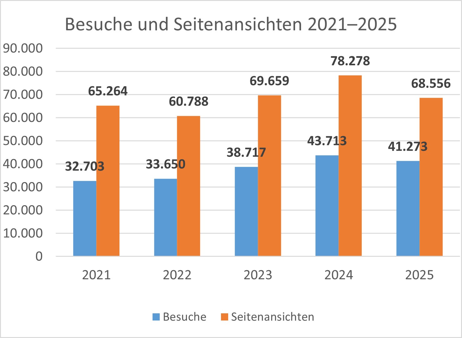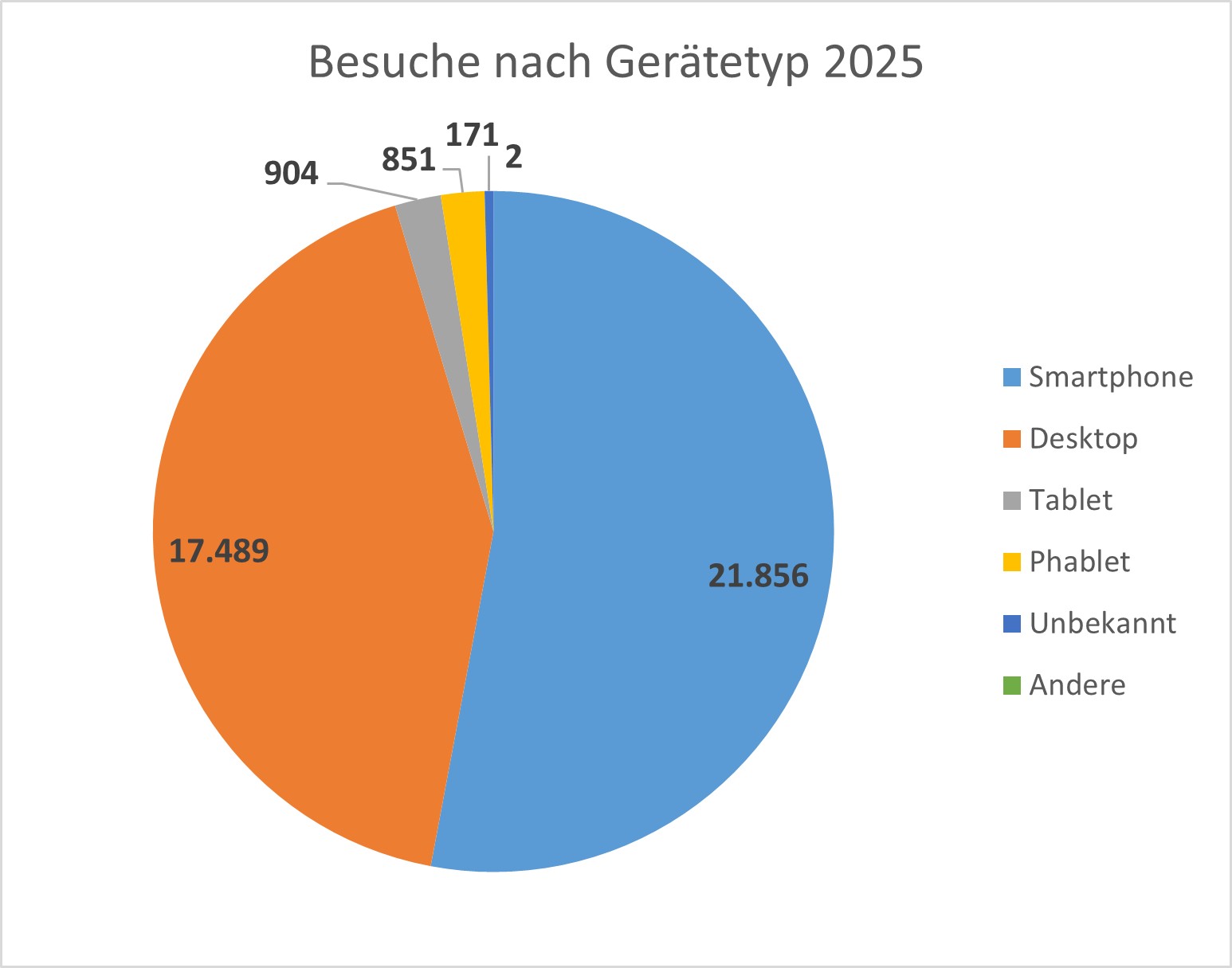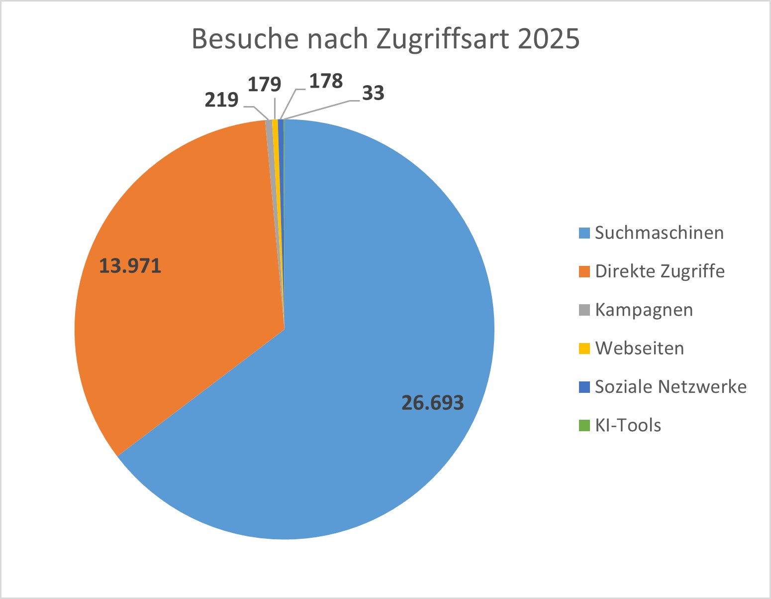 Bei den Besuchen nach Zugriffsart dominieren nach wie vor Suchmaschinen mit einem Anteil von 64,7 Prozent (2024: 68,0 Prozent). Auf den weiteren Plätzen folgen direkte Zugriffe, zum Beispiel über Eingabe in der Adresszeile des Browsers oder Anklicken eines Links in einer E-Mail, mit 33,9 Prozent (2024: 31,0 Prozent) sowie jeweils im Bereich von unter einem Prozent Kampagnen (2025: Social-Media-Kampagne für die Fundraisingstelle), andere Webseiten (wie die Seite des Kita-Verbandes) und soziale Netzwerke (darunter Facebook, Instagram und XING). Erstmals separat erfasst wurden KI-Tools (wie ChatGPT und Perplexity), über die 33 Besuche auf der Website des Kirchenkreises erfolgten.