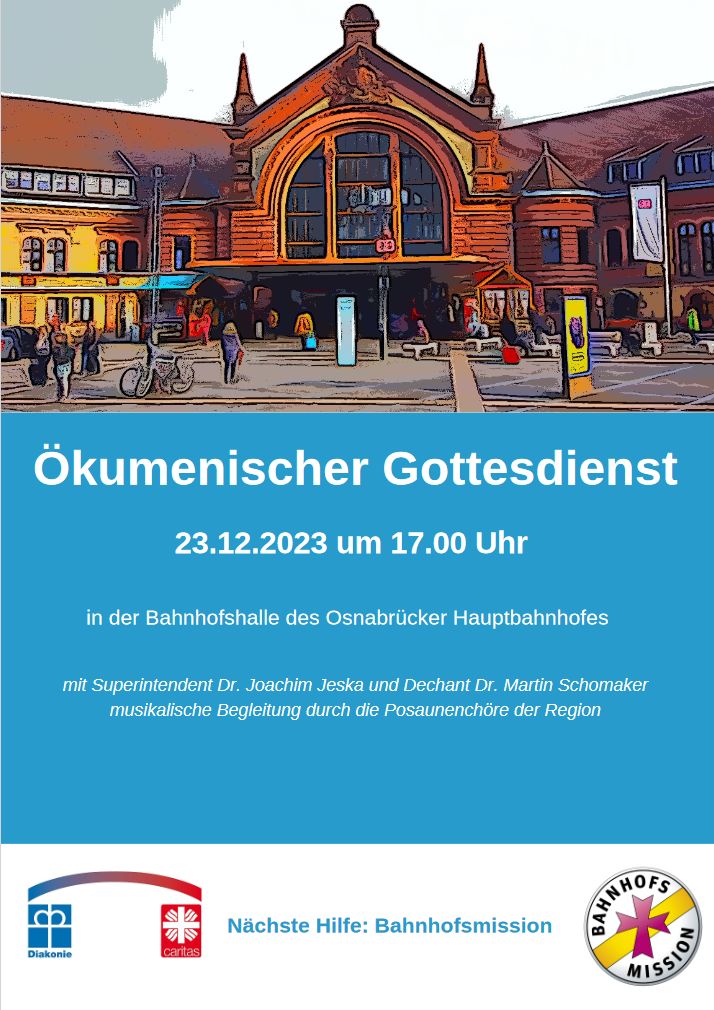 Den Gottesdienst halten Superintendent Dr. Joachim Jeska und Dechant Dr. Martin Schomaker. Die Kollekte ist für die ökumenisch arbeitende Bahnhofsmission Osnabrück bestimmt.