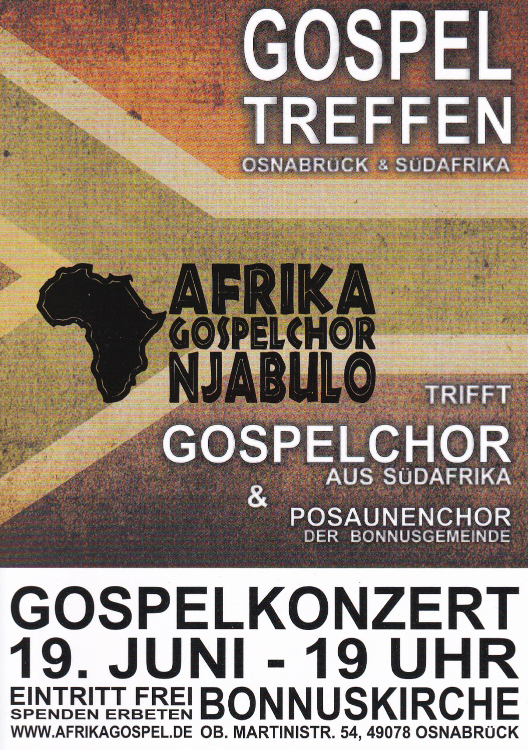 Zu einem Konzert mit dem Titel „Gospel-Treffen Osnabrück & Südafrika“ lädt der Partnerschaftsausschuss des Evangelisch-lutherischen Kirchenkreises Osnabrück am Montag, 19. Juli, um 19 Uhr in die Bonnuskirche, Obere Martinistraße 54, 49078 Osnabrück, ein. Das musikalische Programm des Abends gestaltet zum einen der südafrikanische Gospelchor, der sich aus Mitgliedern der Delegationen aus der Partnerschaftsarbeit zusammensetzt, die derzeit in den Kirchenkreisen Osnabrück, Bramsche und Melle-Georgsmarienhütte zu Besuch sind. Außerdem treten der Afrika Gospelchor Njabulo aus Osnabrück und der Posaunenchor der Bonnusgemeinde auf. Gospelmusik aus Afrika steht für pure Lebensfreude, die dem Gesang und der Musik in jeder Note anzumerken ist. Viel Bewegung, mitreißende Rhythmen und eingängige Melodien kennzeichnen den afrikanischen Gospel und versprechen einen stimmungsvollen Konzertabend in der Bonnuskirche.