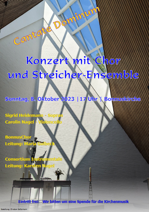 Die Evangelisch-lutherische Bonnusgemeinde Osnabrück lädt am Sonntag, 8. Oktober, um 17 Uhr zu einem Konzert mit dem Bonnus-Chor und einem Streicher-Ensemble in die Bonnuskirche, Obere Martinistraße 54, 49078 Osnabrück, ein. Auf dem Programm steht mit „Cantate Dominum“ ein Werk von Heinrich Schütz. Neben dem Bonnus-Chor unter der Leitung von Maria Golbeck treten Sopranistin Sigrid Heidemann, Carolin Nagel am Violoncello und das Osnabrücker Consortium Instrumentale mit seinem Leiter Karsten Nagel auf.