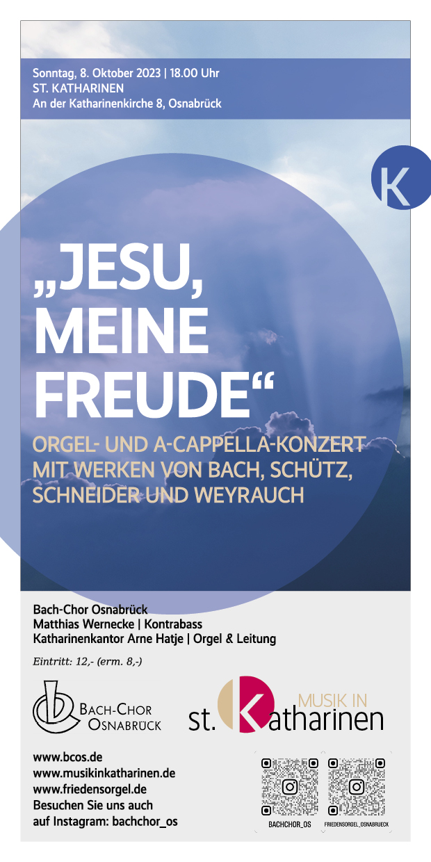 Die Freunde der A-Cappella-Musik des Bach-Chores dürfen sich auf das nächste Konzert freuen, das am Sonntag, 8. Oktober, um 18 Uhr in der Evangelisch-lutherischen St.-Katharinen-Kirche, An der Katharinenkirche, 49074 Osnabrück, stattfindet. Dem Chornamen die Ehre erweisend, ist die fünfstimmige Bach-Motette „Jesu, meine Freude“ das den Abend prägende Werk. Die Motetten Bachs sind seit langer Zeit Bestandteil des Barock-Repertoires eines jeden ambitionierten Chores. Die unterschiedlichsten Aufführungen dieser Urgesteine evangelischer Chormusik haben den Weg zum „wahren“ Bach gesucht: ob gänzlich ohne Instrumente, nur mit einer kleinen Orgel, mit Violoncello und / oder Kontrabass, voll instrumentiert mit den Instrumenten des Barockorchesters, mit kleiner oder monumentaler Chorgröße, im Wechsel von Favorit- und Capellchor und dergleichen mehr. „Wir suchen die Musik der Motette durch die schlichte Begleitung mit einem Orgelcontinuo und einem Kontrabass in unsere Kirche zu locken. Die Orgel bringt unaufdringliche Substanz in den Chorklang, der Kontrabass erdet gewissermaßen und verbindet alles miteinander. Heraus kommt ein zufriedenstellend fülliger Klang, der dennoch schlank genug ist, um die Durchsichtigkeit und Hörbarkeit der polyphonen Stimmen zu gewährleisten“, erklärt Kirchenkreiskantor Arne Hatje.