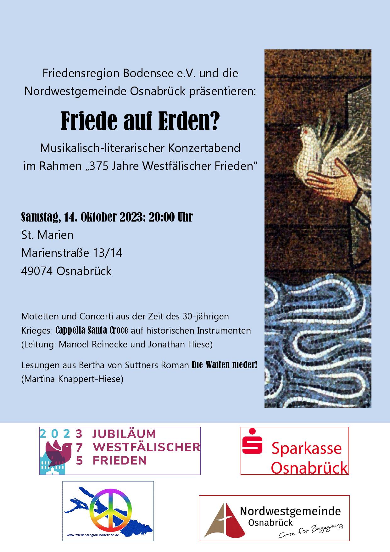 Die Evangelisch-lutherische Nordwestgemeinde Osnabrück und die Friedensregion Bodensee laden am Samstag, 14. Oktober, um 20 Uhr zur Konzertlesung „Friede auf Erden?“ in die Osnabrücker St.-Marien-Kirche ein. Der musikalisch-literarische Konzertabend gehört zum Programm des Jubiläums „375 Jahre Westfälischer Frieden“ und kombiniert Musik aus dem Dreißigjährigen Krieg mit Lesungen aus dem Roman „Die Waffen nieder!“, den die österreichische Autorin und Friedensaktivistin Bertha von Suttner 1889 veröffentlicht hat.