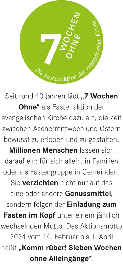 In den Fastenwochen zwischen Aschermittwoch und Ostern lädt „7 Wochen Ohne“ – die Fastenaktion der evangelischen Kirche – seit 1983 Menschen aller Altersgruppen ein, innezuhalten und den Blick auf den Alltag zu verändern: für sich allein, in Familien oder als Fastengruppe. Die Aktion setzt bis Ostern sieben Wochenthemen: „Miteinander gehen“, „Mit den Liebsten“, „Mit denen da drüben“, „Mit der Schöpfung“, „Mit der weiten Welt“, „Mit den Anvertrauten“ und „Mit Gott“. Auf der Internetseite von „7 Wochen Ohne“ heißt es dazu: „Niemand ist allein auf der Welt. Wir sind verbunden mit anderen Menschen, mit der Schöpfung, mit Gott“. Impulse zu den Wochenthemen können per E-Mail abonniert werden.