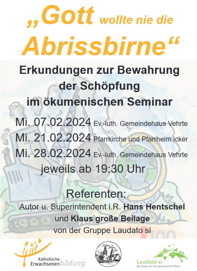 Die Evangelisch-lutherische Johanneskirchengemeinde Vehrte, die katholische Pfarreiengemeinschaft Belm und Icker und die katholische Erwachsenenbildung laden im Februar zu einem „Ökumenischen Seminar“ ein, das sich an mehreren Terminen mit der Bewahrung der Schöpfung befasst.