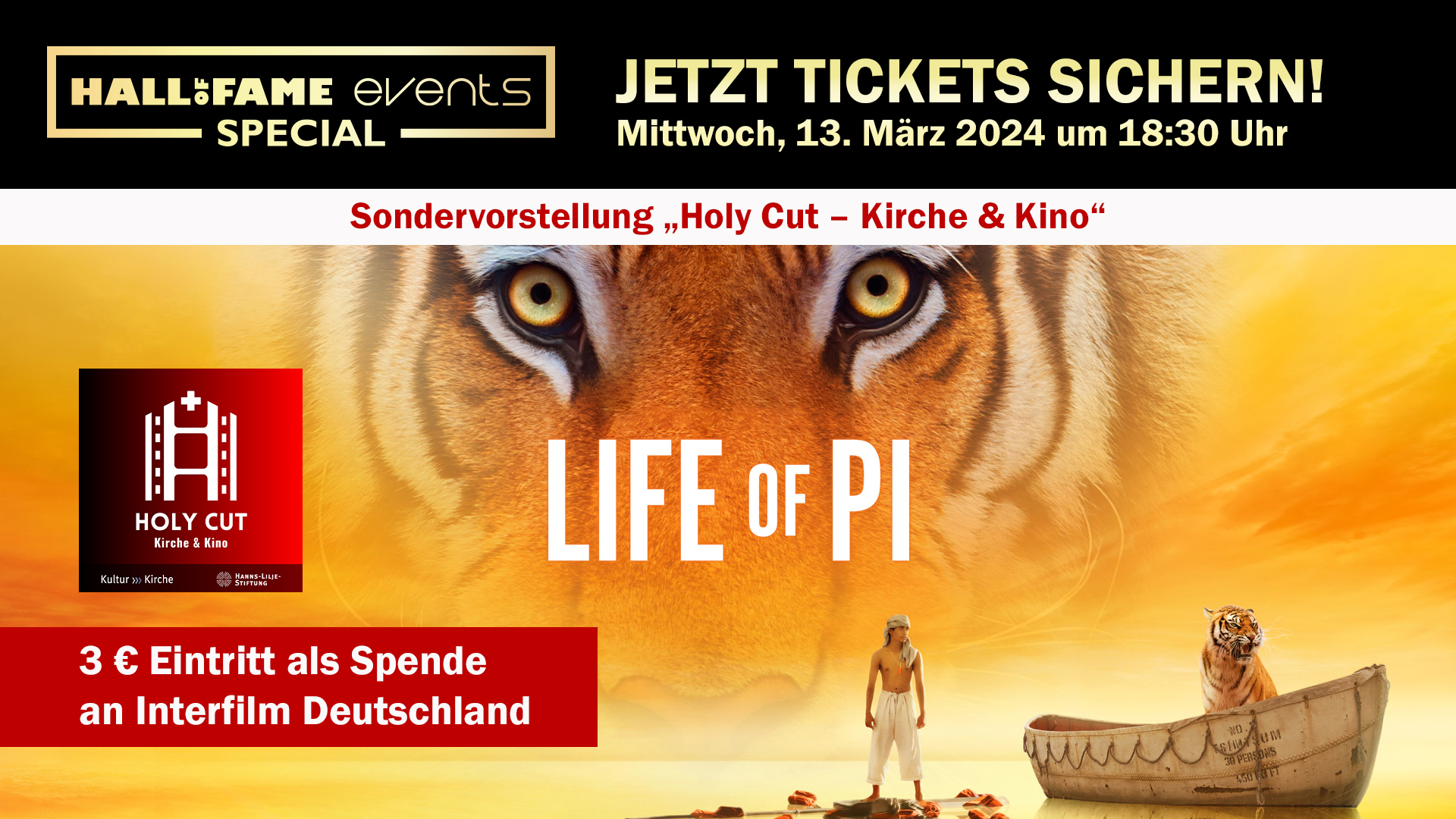 Den Auftakt macht eine Sondervorstellung von „Life of Pi – Schiffbruch mit Tiger“ am Mittwoch, 13. März, um 18:30 Uhr im Kino „Hall of Fame Osnabrück“, Theodor-Heuss-Platz 6 bis 9, 49074 Osnabrück. Ein Ticket kostet 3 Euro, kann online oder an der Abendkasse im Kino gekauft werden. Die Einnahmen kommen Interfilm Deutschland zu Gute. Im Anschluss bleibt Zeit zum Austausch.