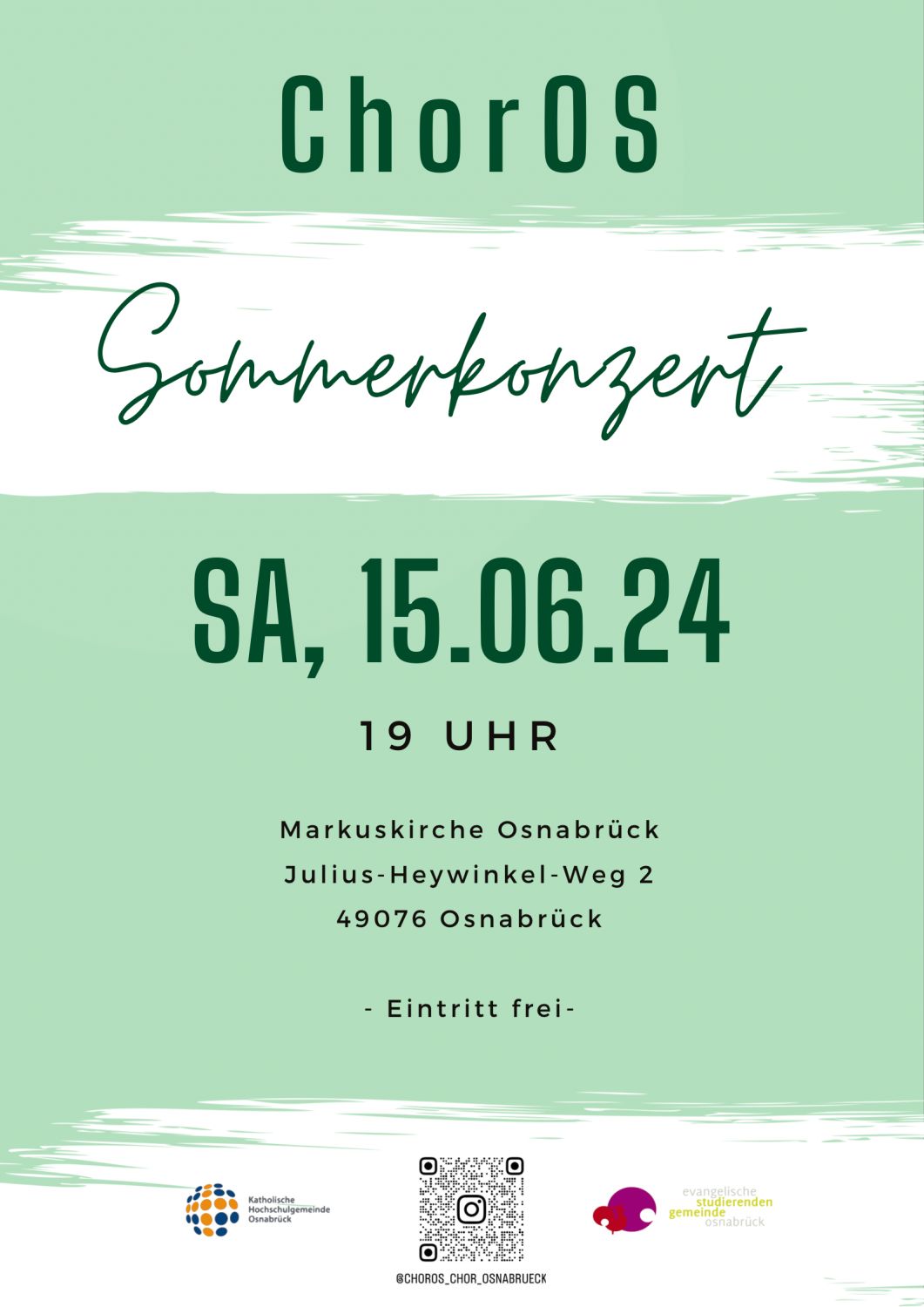 Zum Sommerkonzert des gemeinsamen Chores „ChorOS“ laden die Evangelische Studierendengemeinde und die Katholische Hochschulgemeinde Osnabrück am Samstag, 15. Juni, um 19 Uhr in die Evangelisch-lutherische Markuskirche, Julius-Heywinkel-Weg 2, 49076 Osnabrück, ein. Zum Abschluss des Semesters wartet ein bunter Mix an A-cappella-Liedern aus Film, Musical und Pop auf die Gäste. Der Eintritt ist frei. Am Ausgang wird zugunsten der Chorarbeit um eine Spende gebeten.