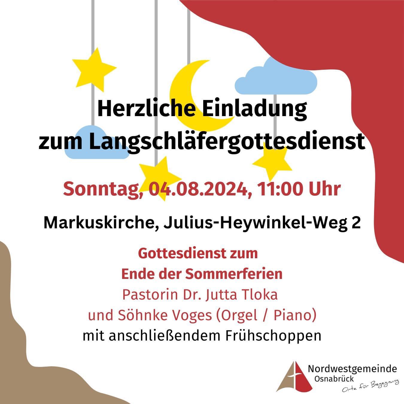 Die Evangelisch-lutherische Nordwestgemeinde lädt am Sonntag, 4. August, um 11 Uhr zu einem „Langschläfergottesdienst“ mit anschließendem Frühschoppen auf die Wiese neben der Markuskirche, bei schlechtem Wetter in die Markuskirche, Julius-Heywinkel-Weg 2, 49076 Osnabrück, ein. „Am letzten Sonntag vor dem Ende der Sommerferien wollen wir die Vorfreude auf die Schule, die leichte Aufregung und vielleicht auch mit ein wenig Wehmut feiern, dass das frühe Aufstehen bald wieder für alle zum Alltag gehört“, sagt Pastorin Dr. Jutta Tloka. Sie gestaltet den Gottesdienst gemeinsam mit Söhnke Voges an Orgel und Piano. Beim Frühschoppen in oder an der Markuskirche gibt es Würstchen und Salat zur Musik von Nhan Gia Vo und Söhnke Voges.