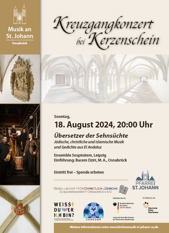 Anschließend findet eine Begegnung im Kreuzgang statt. Das Konzert wird veranstaltet von der Gesellschaft für Christlich-Jüdische Zusammenarbeit Osnabrück, der Pfarrei St. Johann und Cordoba e.V. und wird gefördert von „Weisst du, wer ich bin?“. Der Eintritt ist frei, um eine Spende wird gebeten.