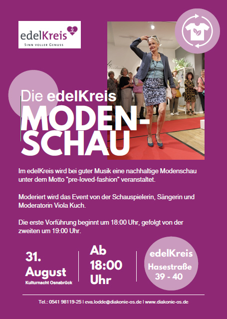 Am Samstag, 31. August, wird der edelKreis bei der Kulturnacht Osnabrück zum Hotspot für Mode und Nachhaltigkeit. Unter dem Motto „pre-loved fashion“ präsentiert das Geschäft in der Hasestr. 39/40, 49074 Osnabrück, einzigartige Outfits in einem besonderen Ambiente, begleitet von guter Musik.