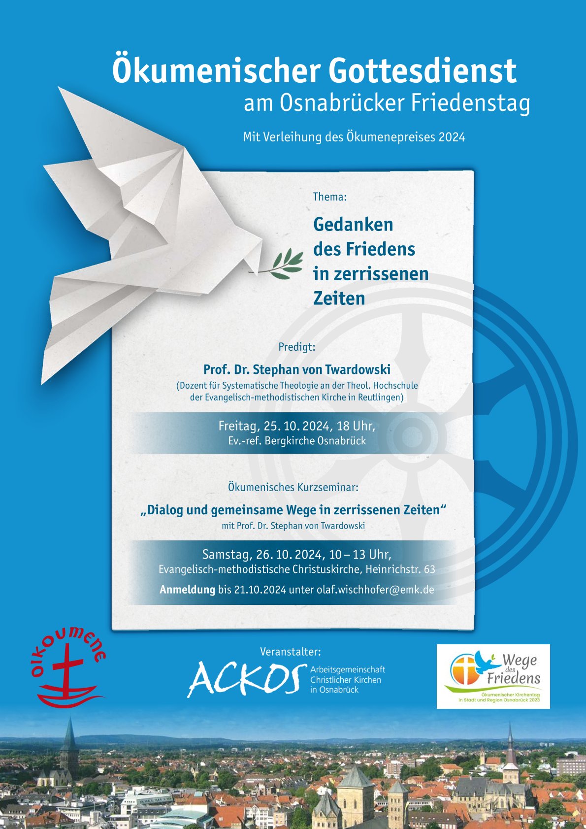 Die Arbeitsgemeinschaft Christlicher Kirchen in Osnabrück (ACKOS) lädt am Freitag, 25. Oktober, dem Tag des Westfälischen Friedens, um 18 Uhr zu einem ökumenischen Gottesdienst in die Bergkirche, Bergstraße 16, 49076 Osnabrück, ein. Die Predigt hält Prof. Dr. Stephan von Twardowski, Mitglied der Evangelisch-methodistischen Kirche, zum Thema „Gedanken des Friedens in zerrissenen Zeiten“. Musikalisch gestaltet wird der Gottesdienst von Wiltrud Fuchs (Orgel) und dem Chor der Evangelisch-reformierten Gemeinde Osnabrück. Weitere Beteiligte sind Mitglieder der in der ACKOS zusammengeschlossenen Kirchen. Der Gottesdienst endet mit der Verleihung des Osnabrücker Ökumenepreises 2024. Der Eintritt ist frei.