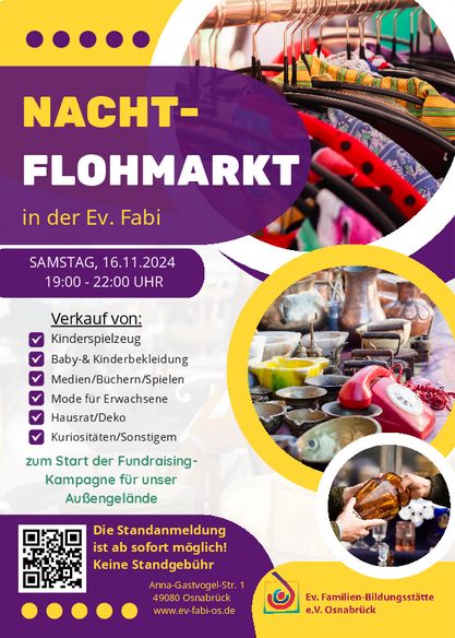 Am Samstag, 16. November, findet nach langer Zeit wieder ein Flohmarkt in der Evangelischen Familienbildungsstätte (Ev. Fabi) statt. Gleichzeitig fällt der Startschuss der Fundraising-Kampagne für das Außengelände der Ev. Fabi. Beim 1. Nachtflohmarkt können die Besucher*innen ab 19 Uhr in allem stöbern, was der Haushalt so hergibt: Kinderkleidung, Spielzeug, Bücher, Spiele, Medien, Mode für Erwachsene, Deko, Hausrat, Kuriositäten und vieles mehr.