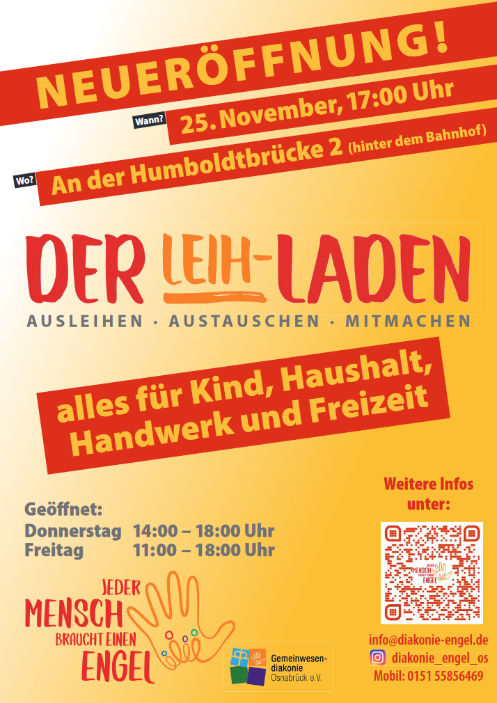 Es gibt viele Gegenstände, die werden nur wenige Tage im Jahr benötigt und anschließend verschwinden sie wieder im Keller. Andere Dinge sind leicht beschädigt und werden entsorgt. Diesem Trend möchte der Arbeitsbereich „Jeder Mensch braucht einen Engel“ entgegenwirken und eröffnet am Montag, 25. November, einen Leih-Laden und ein Reparatur-Café. Als Standort stehen Räume beim Eisenbahner Turn- und Sportverein von 1926 (TSV Osnabrück) zur Verfügung, die sich in der Nähe des Osnabrücker Hauptbahnhofs befinden.