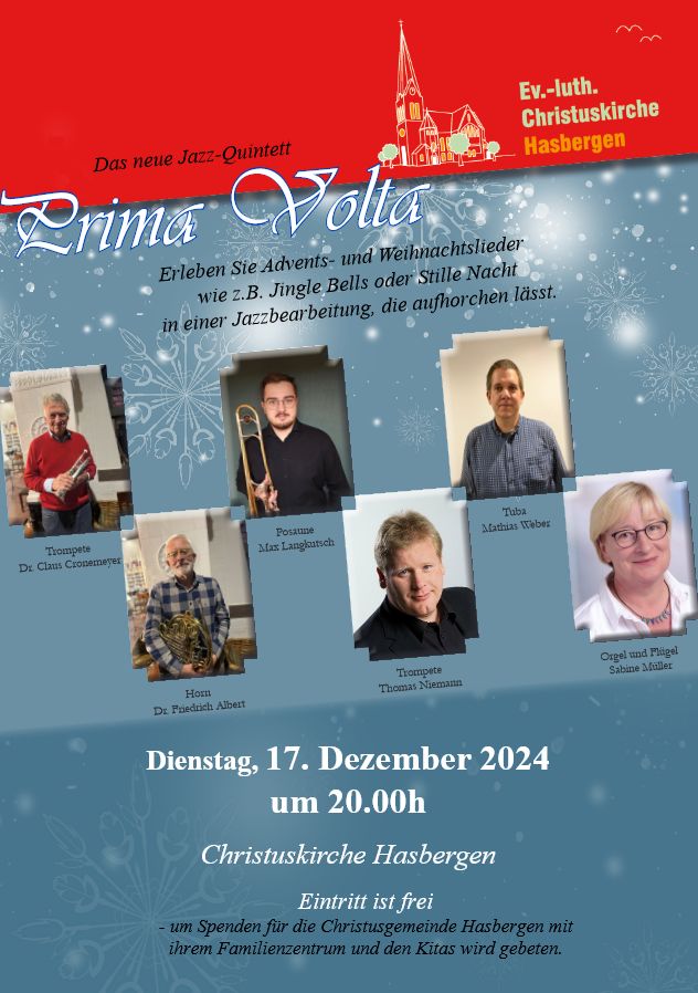 Claus Cronemeyer und sein neues Jazz-Quintett „Prima Volta“ stellen am Dienstag, 17. Dezember, um 20 Uhr bei einem Konzert in der Evangelisch-lutherischen Christuskirche Hasbergen ein jazziges Adventsprogramm vor. Das eigens gegründete Bläserquintett „Prima Volta“ spielt Advents- und Weihnachtslieder, wie zum Beispiel „Jingle Bells“ oder „Stille Nacht, heilige Nacht“ in einer Jazzbearbeitung, die aufhorchen lässt. Es wird auch die Gelegenheit geben, bei so manchem Musikstück mitzusingen und sich ein Stück weit musikalisch auf Weihnachten einstimmen zu lassen. Es spielen Dr. Claus Cronemeyer und Thomas Niemann (Trompete), Dr. Friedrich Albert (Horn), Max Langkutsch (Posaune) und Mathias Weber (Tuba). Ergänzt wird das Blas-Quintett mit Musik von Sabine Müller, die an Orgel und Flügel spielen wird.