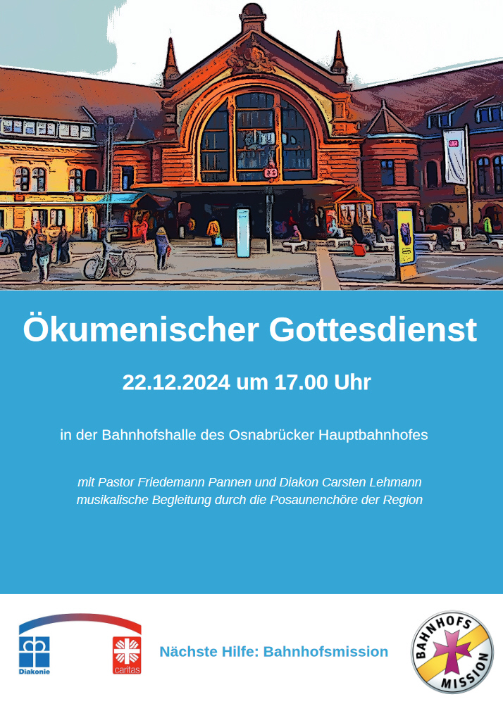 Der Ökumenische Gottesdienst am Osnabrücker Hauptbahnhof findet am Sonntag, 22. Dezember, um 17 Uhr in der Bahnhofshalle statt. Musiker*innen aus verschiedenen Posaunenchören der Region unter der Leitung von Volker Wallrabenstein übernehmen die musikalische Begleitung und sorgen für Adventsstimmung. Den Gottesdienst halten Pastor Friedemann Pannen und Diakon Carsten Lehmann. Die Kollekte ist für die ökumenisch arbeitende Bahnhofsmission Osnabrück bestimmt.