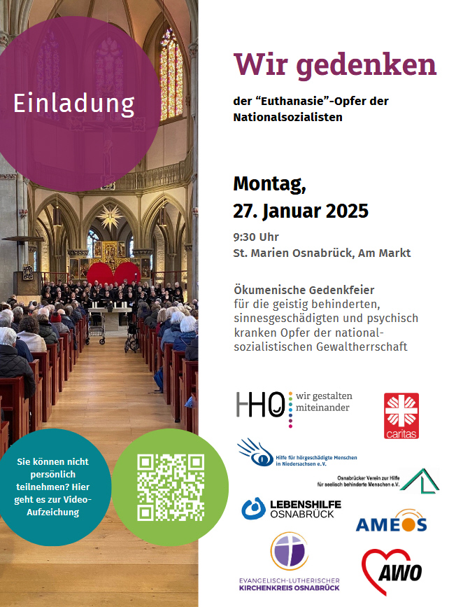 Am Montag, 27. Januar, laden die Heilpädagogische Hilfe Osnabrück, der Evangelisch-lutherische Kirchenkreis Osnabrück und weitere Veranstalter*innen um 9.30 Uhr zu einer ökumenischen Gedenkfeier für die geistig behinderten, sinnesgeschädigten und psychisch kranken Opfer der nationalsozialistischen Gewaltherrschaft in die St.-Marien-Kirche Osnabrück ein.