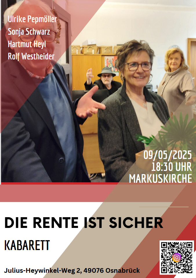 Das Quartett „Heyl & Segen“ tritt am Freitag, 9. Mai, um 18.30 Uhr mit dem Kabarett-Programm „Die Rente ist sicher“ in der Evangelisch-lutherischen Markuskirche, Julius-Heywinkel-Weg 2, 49076 Osnabrück, auf. Ulrike Pepmöller, Sonja Schwarz, Hartmut Heyl und Rolf Westheider fragen sich, ob die Rente zum Abenteuerspielplatz oder Abstellgleis, zur Verheißung oder zur Drohung, zum Auf- oder Abbruch werden kann. Seine Gedanken zum Einstieg in das Rentenalter bringt das Quartett mit Musik auf die Bühne. Der Eintritt ist frei. Um Spenden wird gebeten.