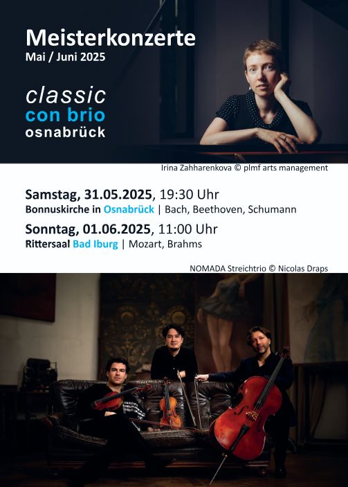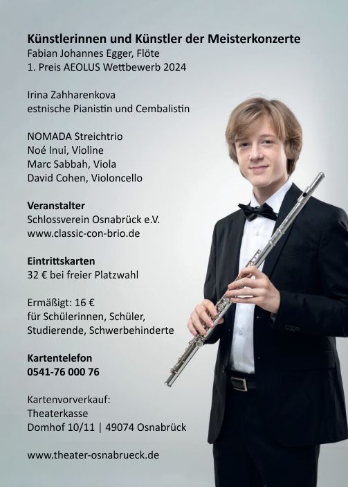 In der Evangelisch-lutherischen Bonnuskirche in Osnabrück beginnt am Samstag, 31. Mai, um 19.30 Uhr ein Meisterkonzert des „Classic Con Brio“-Musikfestivals. Mit dem 18-jährigen Flötisten Fabian Johannes Egger musizieren Irina Zahharenkova am Klavier und das Nomada Streichtrio mit David Cohen (Cello), Noé Unui (Geige) und Marc Sabbah (Bratsche).